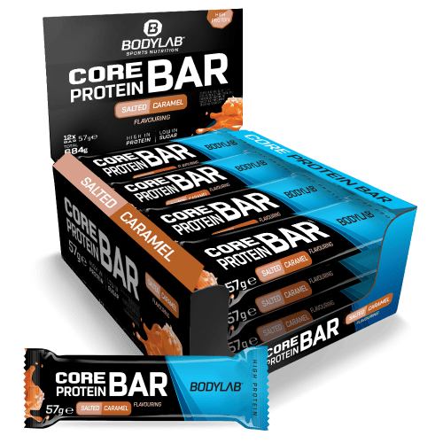 Core Protein Bar Riegel von Bodylab24 mit Salted Caramel Geschmack in der 0.684KG Packung. Core Protein Bar (12 x 57g) – das Proteinplus für zwischendurch 12 Riegel für deinen unkomplizierten Proteinkick. Eine flüssige Karamellfüllung, ein Vollmilchschokoladenüberzug und je Riegel satte 20g Eiweiß. Ein echtes Proteinplus für Training und Alltag – einfach zwischendurch genießen und die Eiweißvorräte des Körpers auffüllen. Sportler:innen wissen, um die Bedeutung von Eiweiß und der allgemeinen Eiweißversorgung für ihre Muskeln – egal ob sie sich im Muskelaufbau- oder in einer normalen Trainingsphase befinden. Die tägliche Versorgung gelingt meist über eine Kombination aus Ernährungsbestandteilen wie Fleisch, Fisch, Milchprodukten oder pflanzlichen Eiweißquellen und Co, bei einem Mehrbedarf sind Proteinshakes häufig die erste Wahl. Dafür wird jedoch immer ein Shaker + Wasser oder Milch benötigt, beides nicht immer zur Hand. Gerade unterwegs oder in einem stressigen Alltag sind Proteinriegel für eine einfache und schnelle Eiweißversorgung genau richtig und können für das ein oder andere Proteinplus sorgen. Im Büro, beim Lernen für Schule und Studium oder bei körperlicher Arbeitsbelastung, ein Riegel ist schnell zur Hand, stillt den ersten Hunger und auch die Lust auf eine kleine Süßigkeit zwischendurch. Der Core Protein Bar liefert Eiweiß durch eine Proteinmischung, bestehend aus Milchprotein als Haupteiweißlieferant, mit einem Zusatz aus Sojaprotein und Sojacrispies. Letztere sorgen auch für einen leicht knusprigen Biss. Der Schokoladenüberzug aus Vollmilchschokolade und der flüssige Karamellkern bieten dazu echtes Schokoriegel-Feeling – also neben dem Proteinzusatz auch einen Ersatz für eine ungesunde Süßigkeit. Überzeug dich selbst und wähle deinen Lieblingsgeschmack. Jede Box beinhaltet 12 Riegel zu je 57g. Der Core Protein Bar (57 g), einzeln verpackt zum leichten Transport und mit fast 35% Eiweiß je Portion. Mehrere Geschmacksvarianten zur Wahl, ca. 200kcal je Portion und eine Proteinmischung liefert 20 g Eiweiß je Riegel.Ideal für die schnelle Proteinversorgung zwischendurch. BITTE BEACHTE: Das Produkt wird ungekühlt geliefert und kann deshalb bei hohen Außentemperaturen schmelzen.