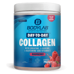 Day to Day Collagen Pulver von Bodylab24 mit Raspberry Geschmack in der 0.75KG Packung. Day to Day Collagen (750 g) – das Kollagen für Alltag und Sport Ein gut lösliches Pulver in mehreren Geschmacksvarianten zur täglichen Nutzung – einfach 2 Messlöffel in Wasser oder je nach Geschmack auch in ein anderes Getränk einrühren und verzehren. Eine Kombination aus: Kollagen – Hauptbestandteil mit 40% und gewonnen aus Rind. Es sorgt u.a. für einen fast 60%igen Eiweißanteil je Portion. L-Glutamin – eine proteinogene Aminosäure, die am Aufbau von Eiweißstrukturen im Körper beteiligt ist und insbesondere in hohen Konzentrationen im Muskelgewebe vorkommt. Kreatin – 3,3 g je Portion (Kreatin verbessert nachweislich die körperliche Leistungsfähigkeit bei aufeinanderfolgenden kurzzeitigen, hochintensiven Übungen. Der beste Effekt wird mit einer täglichen Aufnahme von 3g Kreatin erreicht.) L-Leucin – eine der essenziellen BCAA und spielt insbesondere beim Aufbau von neuem Gewebe eine wesentliche Rolle. Zudem ist Leucin am Proteinstoffwechsel in den Muskeln maßgeblich beteiligt. Gerade Sportler nutzen eine Zusatzsupplementierung zur Unterstützung der Regeneration nach dem Training. Maltodextrin – eine hochwertige und schnell verfügbare Energiequelle. Vitamin C – trägt zu einer normalen Funktion des Immunsystems während und nach intensiver körperlicher Betätigung bei. Das Pulver ist mit Süßstoff gesüßt. Warum Day to Day Collagen Das Day to Day Collagen Pulver wurde entwickelt, um eine einfache und problemlose Möglichkeit zur Zusatzversorgung mit Kollagen zu ermöglichen. Es kann im Alltag ebenso als Nahrungsergänzungsmittel zu einer ausgewogenen und gesunden Ernährung genutzt werden, wie in sportlich intensiven Trainingsphasen. Mit dem Zusatz von Glutamin und Leucin sind weitere Eiweißbausteine zugefügt. Mit mehr als 3 g liefert das Pulver eine Zusatzversorgung an Kreatin. Vitamin C rundet das Produkt als wichtiges Vitamin nicht nur fürs Immunsystem ab. Wähle deinen Lieblingsgeschmack. Das Kollagen aus Rind für die tägliche Zusatzversorgung. Nutze eine Portion am Tag, einfach in Wasser einrühren. Das Pulver ist gut löslich und lässt sich rund ums Training nutzen oder einfach im Alltag.