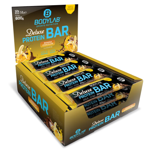 Deluxe Protein Bar Riegel von Bodylab24 mit Banana Chocolate Flavouring Geschmack in der 0.6KG Packung. Deluxe Protein Bar (50g) von Bodylab24 – jetzt neu Unser neuer Eiweißriegel enthält je 50g Portion 11g Eiweiß, Ballaststoffe, wenig Zucker (mit Süßungsmittel gesüßt) und ist mit einem leckeren Vollmilch-Schokoladenüberzug umhüllt – hat also alles, was eine kleine Sünde zwischendurch benötigt, um auch das Sportlerherz höher schlagen zu lassen. Soft & smooth – das ist der neue Deluxe Protein Bar von Bodylab24. Zwei Varianten gibt es zur Auswahl – Chocolate Peanut-Caramel und Banana Chocolate Flavouring. Je Box sind 12 Riegel einer Sorte enthalten. Proteinriegel – die kleine Eiweißstärkung zwischendurch Proteinriegel sind eine gute Möglichkeit überall und einfach zwischendurch für einen Eiweißkick zu sorgen. Sie sind ideal für unterwegs, können im Alltag genutzt werden, eine Mahlzeit als ‚Nachtisch‘ mit zusätzlichem Protein anreichern oder rund ums Training Verwendung finden. Einer der 50g Deluxe Protein Bar liefert 11g Eiweiß, um die 6g Ballaststoffe bei rund 2g Zucker. Gesüßt ist mit Süßstoff (Maltit). Eine einfach und bequeme Art Deine Eiweißversorgung anzureichern. Eiweißlieferanten sind Vollmilchpulver, Milcheiweiß und Sojaprotein – der Schokoladenüberzug sorgt für richtiges Schokoriegel-Feeling. Bei deutlich weniger Zucker und auch weniger Fettanteil. Beide Varianten liegen unter 200kcal. Der Riegel mit Peanut-Caramel Flavouring enthält neben Erdnussaroma auch echte Erdnüsse und Soja-Crispies, für einen leicht crunchigen Biss, der dennoch immer noch soft und smooth ist. Gönn Dir eine kleine Auszeit und versorg Dich mit einer leckeren Portion Protein. Ein neuer Eiweißriegel bei Bodylab24 – der Deluxe Protein Bar (50g). Vollmilchschokoladen-Überzug, 11g Eiweiß je Riegel, Ballaststoffe, wenig Zucker und soft & smooth im Biss – die perfekte, kleine Zwischenmahlzeit. Ideal für unterwegs, im Alltag oder rund ums Training. Jede Box enthält 12 einzeln verpackte Riegel. Du hast die Wahl zwischen Chocolate Peanut-Caramel oder Banana Chocolate Flavouring.