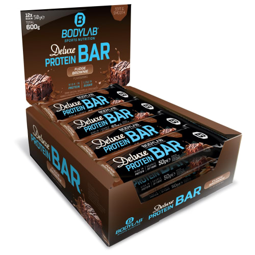 Deluxe Protein Bar Riegel von Bodylab24 mit Fudge Brownie Geschmack in der 0.6KG Packung. Der softe Deluxe Protein Bar (50g) von Bodylab24 Unser 50g Deluxe Protein Bar enthält je Portion 11 -13g Eiweiß (je nach gewähltem Geschmack), Ballaststoffe, wenig Zucker (mit Süßungsmittel gesüßt) und ist mit einem leckeren Vollmilch-Schokoladenüberzug umhüllt. Hat also alles, was eine kleine Sünde zwischendurch benötigt, um auch das Sportlerherz höher schlagen zu lassen. Soft & smooth – das ist der Deluxe Protein Bar von Bodylab24. Mehrere Varianten gibt es zur Auswahl. Je Box sind 12 Riegel einer Sorte enthalten. Proteinriegel – die kleine Eiweißstärkung zwischendurch Proteinriegel sind eine gute Möglichkeit überall und einfach zwischendurch für einen Eiweißkick zu sorgen. Sie sind ideal für unterwegs, können im Alltag genutzt werden, eine Mahlzeit als ‚Nachtisch‘ mit zusätzlichem Protein anreichern oder rund ums Training Verwendung finden. Einer der 50g Deluxe Protein Bar liefert 11-13g Eiweiß, um die 6-6,5g Ballaststoffe bei rund 2-3,5g Zucker. Die Angaben variieren je Geschmacksrichtung – nähere Infos zum genauen Nährstoffgehalt unter den Nährstoffen nach Auswahl des gewünshten Geschmacks. Gesüßt ist mit Süßstoff (Maltit). Eine einfach und bequeme Art Deine Eiweißversorgung anzureichern. Eiweißlieferanten sind Vollmilchpulver, Milcheiweiß und Sojaprotein – der Schokoladenüberzug sorgt für richtiges Schokoriegel-Feeling. Bei deutlich weniger Zucker und auch weniger Fettanteil. Alle Varianten liegen unter 200kcal je Portion. Der Riegel mit Peanut-Caramel Flavouring enthält neben Erdnussaroma auch echte Erdnüsse und Soja-Crispies, für einen leicht crunchigen Biss, der dennoch immer noch soft und smooth ist. Gönn Dir eine kleine Auszeit und versorg Dich mit einer leckeren Portion Protein. Der softe 50g Eiweißriegel bei Bodylab24 – der Deluxe Protein Bar. Vollmilchschokoladen-Überzug, 11-13g Eiweiß je Riegel, Ballaststoffe, wenig Zucker und soft & smooth im Biss – die perfekte, kleine Zwischenmahlzeit. Ideal für unterwegs, im Alltag oder rund ums Training. Jede Box enthält 12 einzeln verpackte Riegel. Du hast die Wahl zwischen mehreren Geschmacksvarianten.
