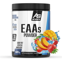 EAA Pulver von All Stars mit Strawberry-Mango Geschmack in der 0.42KG Packung. All Stars – EAAs Eine Mischung aus allen essentiellen Aminosäuren, die als Pulver mit Wasser gemischt ein lecker fruchtiges Getränk ergeben. EAAs von All Stars – Vorteile: alle essentiellen Aminosäuren enthalten 10000mg Aminosäuren je Portion mikronisiertes und instantisiertes Pulver gut löslich Was beinhaltet EAAs von All Stars? Das Pulver beinhaltet 10000mg aller essentiellen Aminosäuren. Dazu zählen L-Leucin, L-Lysin, L-Threonin, L-Valin, L-Isoleucin, L-Methionin, L-Phenylalanin und L-Tryptophan. Das Pulver ist fettfrei und enthält je Portion nur geringste Mengen Kohlenhydrate (0,9g) und Zucker ( Eine Mischung aus allen essentiellen Aminosäuren, die als Pulver mit Wasser gemischt ein lecker fruchtiges Getränk ergeben.