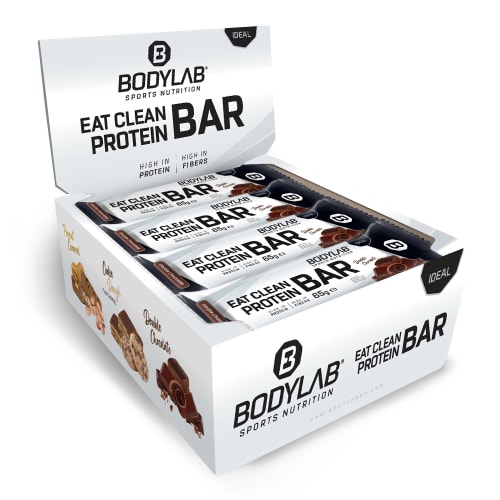 Eat Clean Protein Bar Riegel von Bodylab24 mit Double-Choco Geschmack in der 0.78KG Packung. Eat Clean Protein Bar von Bodylab24 Bodylab hat, was du suchst: Einen leckeren Proteinriegel mit hochwertigen Inhaltsstoffen zu einem sensationellen Preis. Der Eat Clean Protein Bar ist extrem praktisch im Gebrauch. Einziges Problem: Auch deine Freunde/innen werden ihn lieben! Hab ein Auge auf deine Box sonst ist sie schneller leer als dir lieb ist! Was ist drin im Eat Clean Protein Bar? Der Eat Clean Protein Bar enthält vorwiegend Milchprotein und Isomalto-Oligosaccharide (IMO). Milchprotein ist bekannt für sein qualitativ hochwertiges Eiweiß und eine besonders hohe biologische Wertigkeit. Jeder Riegel ist ausschließlich mit Steviolglycosiden gesüßt. Eat Clean Protein Bar enthalten keine Stoffe, die besser nicht enthalten sein sollten, wie diverse Füllstoffe (z.B. Gelatine) oder künstliche Süßstoffe (z.B. Aspartam). Die Welt der Protein-Riegel hat sich mit der Einführung der Eat Clean Protein Bar für immer verändert! Nach langem Entwicklungsprozess ist es Bodylab24 gelungen, einen Protein-Riegel zu schaffen, der keine Kompromisse eingeht. Ein unglaublicher Geschmack, beste Nährwerte und keine überflüssigen Zutaten. Jeder Riegel bietet 20g Eiweiß, gewonnen aus Milcheiweiß. Diese Proteinquelle zeichnet sich durch eine allmähliche Freigabe an den Körper und eine hohe biologische Wertigkeit aus. Ideal für die Unterstützung der Muskelregeneration nach dem Training! Für wen sind Eat Clean Protein Bar von Bodylab24 geeignet? Der Eat Clean ist generell für jeden Sportler geeignet. Aber er ist nicht nur ein Protein-Riegel für Sportler, sondern auch ein idealer Snack für jeden, der einen leckeren Riegel mit wenig Kalorien, Zucker, Fett oder anderen Zusätzen genießen möchte. Ideal für die Proteinversorgung unterwegs!