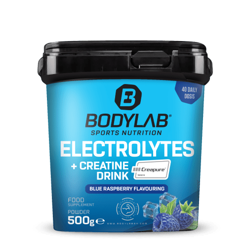 Electrolytes + Creatine Drink Pulver von Bodylab24 mit Blaue Himbeere Geschmack in der 0.5KG Packung. Electrolytes + Creatine Drink (Creapure®) (500g) Die Elektrolyt-Kreatinmischung für dein Training. Essenzielle Elektrolyte treffen auf hochwertiges Kreatin als Creapure®- hergestellt in Deutschland. Mehr als 4,4 g je Portion. Mit Wasser gemischt ergibt sich ein erfrischendes Sportgetränk. Aromatisiert und gesüßt aber ohne Zuckerzusatz. Volle Power in jeder Portion: Magnesium: trägt zur Verringerung von Müdigkeit und Ermüdung bei, ist am normalen Energiestoffwechsel und der normalen Muskelfunktion beteiligt. Kalium trägt zu einer normalen Funktion des Nervensystems und zu einer normalen Muskelfunktion bei. Kreatin erhöht die körperliche Leistung bei Schnellkrafttraining im Rahmen kurzzeitiger intensiver körperlicher Betätigung (ab einer täglichen Einnahme von 3 g). Deine Vorteile: Optimale Hydration und Muskelfunktion – ersetzt essenzielle Mineralstoffe/Spurenelemente, die du beim Schwitzen verlierst. Made in Germany – hochwertiges Creapure®. Liefert mehr als 3 g reines Kreatin pro Portion. Zuckerarm, leicht löslich und mit erfrischendem Geschmack. Wenig Kalorien – daher auch in Definitionsphasen perfekt nutzbar. Egal ob du Gewichte stemmst, im Mannschaftstraining alles gibst, dich für den nächsten Marathon vorbereitest oder im Wettkampf alles gibst – Electrolytes + Creatine Drink (Creapure® versorgt dich mit Mineralstoffen und einer Portion Kreatin – und unterstützt so deine tägliche Sport-Performance. Für alle entwickelt, die sportliche Leistung und Performance leben und intensiv trainieren. Probier’s aus! Dein Begleiter für intensive Trainingseinheiten und schnelle Regeneration. Entwickelt für Sportler, die alles geben – ob beim Krafttraining, Crossfit, Teamsport oder bei Ausdauereinheiten.