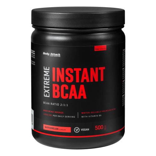 Extreme Instant BCAA Pulver von Body Attack mit Watermelon Geschmack in der 0.5KG Packung. Extreme Instant BCAA von Body Attack Das Extreme Instant BCAA von Body Attack ist ein mikrofeines Getränkepulver, mit den essentiellen Aminosäuren BCAA (Leucin, Isoleucin und Valin). Und das nicht zu knapp. Denn das Extreme Instant BCAA liefert dir BCAAs in Höhe von 10g pro Tagesportion. Während intensiver Trainingsphasen kann das Extreme Instant BCAA eine ausreichende Proteinversorgung unterstützen, die wiederum wichtig ist für den Muskelaufbau und den Muskelerhalt. Das Pulver enthält außerdem Vitamin B6, das der Körper für die Verstoffwechslung von Proteinen und Aminosäuren benötigt. Das Body Attack BCAA-Pulver eignet sich für Kraftsportler, Bodybuilder und Ausdauersportler während intensiver Trainingsphasen, zum Beispiel in der Wettkampvorbereitung. Auch während einer ketogenen Diät liefert der BCAA-Drink wichtige Proteinbausteine. Ausdauersportler, die sich eher eiweißarm ernähren, können mit dem Extreme Instant BCAA ebenfalls zu ihrer Proteinversorgung beitragen und so den Muskelerhalt unterstützen. Allergene: Enthält Soja. Verzehrempfehlung: An Trainingstagen 13g (1 gehäufter Messlöffel) in 350ml kaltes Wasser mixen und vor, während oder nach dem Training verzehren. An Tagen ohne Training eine Portion morgens nach dem Aufstehen. Extreme Instant BCAA – 500g – Watermelon hat die PZN 12502043. Für harte Trainingsphasen!