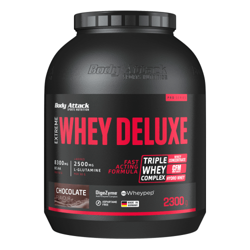 Extreme-Whey Deluxe Pulver von Body Attack mit Chocolate Cream Geschmack in der 2.3KG Packung. Extreme-Whey Deluxe von Body Attack Das Extreme-Whey Deluxe von Body Attack ist kein normales Whey, denn es wird aus 3 verschiedenen Komponenten gewonnen. Durch die Mischung aus ultrafiltriertem und ionengetauschtem Whey Protein Konzentrat, mikrofiltriertem Whey Protein Isolat und Molkenhydrolysat ist das Ergebniss ein Proteinpulver mit hohem Eiweißgehalt und geringem Kohlenhydrat- und Fettanteil. Nicht nur vom Nährwertprofil überzeugt das Extreme-Whey von Body Attack. Egal ob mit Wasser oder Milch gemixed, das Proteinpulver löst sich perfekt und sorgt für cremigen und leckeren Geschmack. Extreme-Whey Deluxe – 2300g – Chocolate Cream hat die PZN 09208848. Mehr als nur ein Whey-Protein!