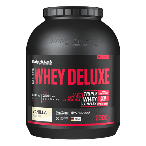 Extreme-Whey Deluxe Pulver von Body Attack mit Vanilla Cream Geschmack in der 2.3KG Packung. Extreme-Whey Deluxe von Body Attack Das Extreme-Whey Deluxe von Body Attack ist kein normales Whey, denn es wird aus 3 verschiedenen Komponenten gewonnen. Durch die Mischung aus ultrafiltriertem und ionengetauschtem Whey Protein Konzentrat, mikrofiltriertem Whey Protein Isolat und Molkenhydrolysat ist das Ergebniss ein Proteinpulver mit hohem Eiweißgehalt und geringem Kohlenhydrat- und Fettanteil. Nicht nur vom Nährwertprofil überzeugt das Extreme-Whey von Body Attack. Egal ob mit Wasser oder Milch gemixed, das Proteinpulver löst sich perfekt und sorgt für cremigen und leckeren Geschmack. Extreme-Whey Deluxe – 2300g – Vanilla Cream hat die PZN 09208989. Mehr als nur ein Whey-Protein!