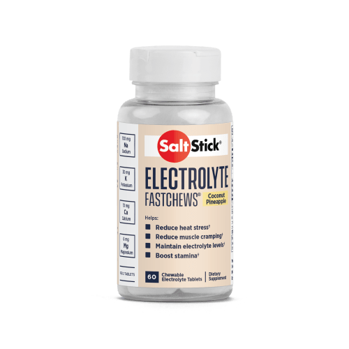 FastChews Kapseln von SaltStick mit Coconut Pineapple Geschmack in der 0.096KG Packung. SaltStick FastChews Die SaltStick FastChews sind ein Nahrungsergänzungsmittel mit Salz-, Mineralstoffen und Kohlenhydraten. Starker Schweißverlust durch extreme Muskelarbeit führt zur Ausschwemmung von Salz und Mineralstoffen (Elektrolyte). Dies kann die Aufrechterhaltung der körperlichen Leistungsfähigkeit, die Funktionalität der Muskulatur und die Regeneration beeinträchtigen. Die Kautabletten mit hohem Salz- und Mineralstoffanteil helfen den Salz- und Elektrolytspiegel in der angemessenen Balance zu halten. Was macht die SaltStick FastChews besonders? Die Premium-Mineralstoff-Formel der SaltStick FastChews entspricht der Zusammensetzung der ausgeschiedenen Elektrolyte im Schweiß des menschliches Körpers und sorgt für eine schnelle Bioverfügbarkeit aller an der Muskelfunktionalität beteiligten Elektrolyte: Natrium (Salz), Kalium, Magnesium und Calcium. Wie viele SaltStick FastChews brauche ich für meinen Sport? Bei Dauer-Belastungen jeweils 2 Kautabletten (= Portion) alle 15-30 Minuten. Während langandauernder, starker körperlicher Belastung bis zu maximal 50 Kautabletten täglich. Optimale Elektrolytversorgung to go!