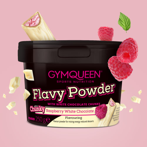 Flavy Powder Pulver von GYMQUEEN mit Chunky Himbeer Weiße Schokolade Geschmack in der 0.25KG Packung. Du möchtest nicht auf guten Geschmack und Genuss verzichten, aber gleichzeitig deinen Zuckerkonsum reduzieren? 1 Dann ist unser Flavy Powder genau das Richtige für dich! Mit dem Geschmackspulver kannst du langweilige Speisen und Getränke im Handumdrehen in wahre Geschmacksexplosionen verwandeln. Dank unserer vielfältigen Sortenauswahl wird dir dabei auch garantiert niemals langweilig. Unser Flavy Powder ist zudem reich an Ballaststoffen und enthält je nach Sorte nur 10 kcal pro Portion. So kannst du deine eigenen süßen Kreationen in kalorien- und zuckerreduziert1 und dafür mit vollem Geschmack genießen. Mische je nach Sorte 5g Pulver in 400g oder 3g Pulver (1 Messlöffel) in 250g Joghurt, Quark, Abnehm-Shakes, Proteinshakes oder Backmischungen und fertig ist dein kalorienreduziertes 1 Lieblingsdessert. 1 Wenn du, anstatt auf herkömmliche Desserts zurückzugreifen, deine Desserts mit den kalorienarmen Flavy Powders selbst zubereitest, kannst du dabei Zucker und Kalorien sparen. Noch nie war Zucker und Kalorien sparen 1 so lecker! Mit dem Flavy Powder kannst du fade Speisen wie Quark, Joghurt, Porridge oder Müsli ganz einfach aufwerten und auf ein neues Geschmacksniveau bringen. Kreiere im Handumdrehen deine kalorien- und zuckerreduzierten1 Lieblingsdesserts und genieße ganz ohne Verzicht!