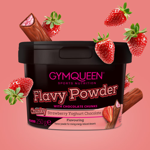 Flavy Powder Pulver von GYMQUEEN mit Chunky Erdbeer Joghurt Schoko Geschmack in der 0.25KG Packung. Du möchtest nicht auf guten Geschmack und Genuss verzichten, aber gleichzeitig deinen Zuckerkonsum reduzieren? 1 Dann ist unser Flavy Powder genau das Richtige für dich! Mit dem Geschmackspulver kannst du langweilige Speisen und Getränke im Handumdrehen in wahre Geschmacksexplosionen verwandeln. Dank unserer vielfältigen Sortenauswahl wird dir dabei auch garantiert niemals langweilig. Unser Flavy Powder ist zudem reich an Ballaststoffen und enthält je nach Sorte nur 10 kcal pro Portion. So kannst du deine eigenen süßen Kreationen in kalorien- und zuckerreduziert1 und dafür mit vollem Geschmack genießen. Mische je nach Sorte 5g Pulver in 400g oder 3g Pulver (1 Messlöffel) in 250g Joghurt, Quark, Abnehm-Shakes, Proteinshakes oder Backmischungen und fertig ist dein kalorienreduziertes 1 Lieblingsdessert. 1 Wenn du, anstatt auf herkömmliche Desserts zurückzugreifen, deine Desserts mit den kalorienarmen Flavy Powders selbst zubereitest, kannst du dabei Zucker und Kalorien sparen. Noch nie war Zucker und Kalorien sparen 1 so lecker! Mit dem Flavy Powder kannst du fade Speisen wie Quark, Joghurt, Porridge oder Müsli ganz einfach aufwerten und auf ein neues Geschmacksniveau bringen. Kreiere im Handumdrehen deine kalorien- und zuckerreduzierten1 Lieblingsdesserts und genieße ganz ohne Verzicht!