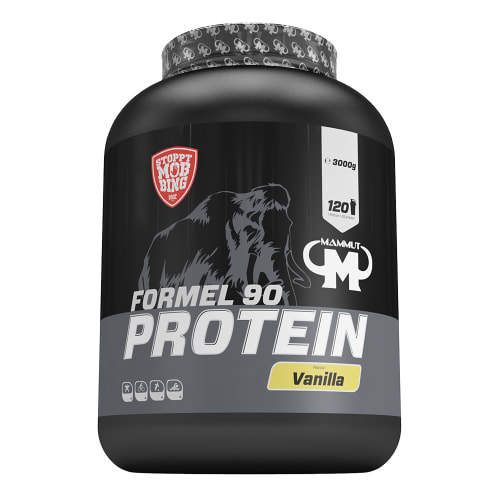 Formel 90 Protein Pulver von Mammut mit Vanilla Geschmack in der 3KG Packung. Mammut – Formel 90 Protein 3000 g 3kg Vorratspackung des Formel 90 Proteins von Mammut – eine ideale Unterstützung für Deine Proteinversorgung über den Tag oder nach dem Training – erhältlich in zahlreichen leckeren Geschmacksrichtungen. Formel 90 Protein von Mammut – Vorteile: 4 verschiedene Eiweißquellen ca. 77% Protein je Portion zur Unterstützung des Muskelaufbaus und der Regeneration Nutzung nach dem Training oder als proteinreiche Zwischenmahlzeit angereichert mit Vitamin B6 Was beinhaltet das Formel 90 Proteinpulver? Formel 90 Protein ist ein Eiweißpulver mit 4 verschiedenen Eiweißquellen. Es beinhaltet Protein aus Soja, Milch, Molke und Hühnerei und wurde mit Vitamin B6 angereichert. Je Portion (Pulver gemischt mit fettarmner Milch) enthält der Shake fast 30g Protein. Der Shake ist mit Süßstoffen gesüßt. Warum Formel 90 Protein? Ein Shake aus Formel 90 Protein und Milch kann die Proteinversorgung über den Tag anreichern oder direkt nach dem Training eine Unterstützung für die Regeneration bieten. Das Pulver ist in verschiedenen Geschmacksrichtungen verfügbar.Eiweiß spielt eine wichtige Rolle beim Muskelaufbau und -erhalt. Es wird von Sportlern genutzt, kann aber auch von allen aktiven Menschen für die Eiweißversorgung verwendet werden.Das Formel 90 Protein wurde von Mammut mit Vitamin B6 angereichert, dass zu einem normalen Energie-, Eiweiß- und Glykogenstoffwechsel beiträgt und die normale Funktion des Immunsystems unterstützt Wie wird Formel 90 Perotein verwendet und von wem? Du kannst einen Formel 90 Protein Shake (25g Pulver + 300ml fettarme Milch) als Zwischenmahlzeit über den Tag und/oder direkt nach dem Training trinken.Der Shake kann von Athleten der unterschiedlichsten Sportarten, von körperlich besonders Aktiven und/oder von Personen genutzt werden, die ihre Proteinversorgung anreichern möchten, um Muskelwachstum oder -erhaltung anzuregen. Vier Proteinquellen, mit Vitamin B6 angereichert – eine ideale Unterstützung für deine Proteinversorgung über den Tag oder nach dem Training.