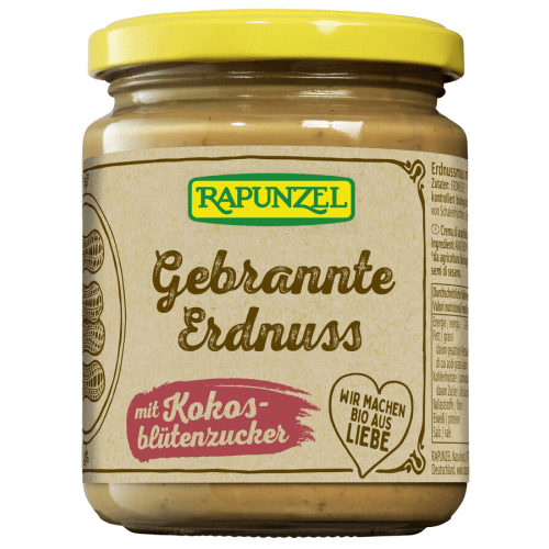 Gebrannte Erdnuss Aufstrich mit Kokosblütenzucker bio Rapunzel. Eco control number: DE-ÖKO-006 Das weckt süße Erinnerungen an Jahrmarktbesuche: 81% frisch geröstete, aromatische Erdnüsse von Rapunzel, veredelt mit der feinen Karamellnote von Kokosblütenzucker. Eine Prise Meersalz und echte Bourbon-Vanille runden den Genuss ab. Die grobe Vermahlung sorgt für einen unwiderstehlichen Crunch.