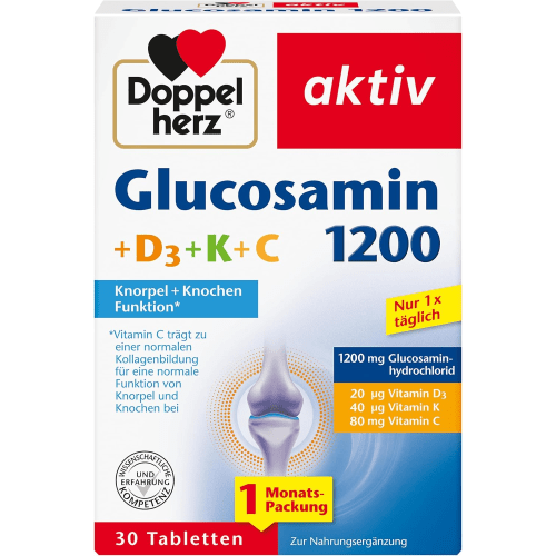Glucosamin 1200 Tabletten von Doppelherz. Glucosamin 1200 von Doppelherz Vitamin C trägt zur normalen Kollagenbildung und damit für eine normale Funktion von Knorpeln und Knochen bei. Die Vitamine K und D leisten einen Beitrag zum Erhalt normaler Knochen. Vitamin D unterstützt den Erhalt der normalen Muskelfunktion. Es leistet einen Beitrag für die normale Verwertung von Calcium und für einen normalen Calciumspiegel im Blut. Vitamin E und Vitamin C tragen dazu bei, die Zellen vor oxidativem Stress zu schützen. Die Tabletten von Doppelherz enthalten eine Kombination von Vitaminen, die Gesundheit und Wohlbefinden des Körpers gezielt unterstützen. Gesunde Knorpel und Knochen sind eine wichtige Voraussetzung für einen intakten Bewegungsapparat. Ein gesunder Bewegungsapparat ist eine Voraussetzung für Lebensqualität in jedem Alter. Ausreichende schonende Bewegung sowie gesunde Ernährung können hierzu einen Beitrag leisten. Deshalb ist es wichtig, auf eine bedarfsgerechte Versorgung an Nährstoffen zu achten, die die Bildung von Kollagen unterstützen und zum Erhalt normaler Knochen und zu einer normalen Muskel- und Knorpelfunktion beitragen. Doppelherz Glucosamin 1200 enthält Vitamin C, Vitamin E, Vitamin K und Vitamin D. Zusätzlich enthalten ist 1200 mg Glucosaminhydrochlorid – in nur 1 Tablette.
