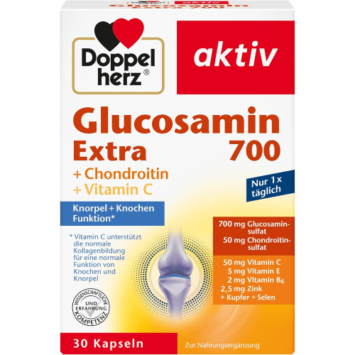 Glucosamin extra 700 Kapseln von Doppelherz. Glucosamin extra 700 Kapseln von Doppelherz Doppelherz Glucosamin Extra 700 Kapseln enthalten eine Kombination der lebenswichtigen Mikronährstoffe Vitamin C, Kupfer, Selen und Zink. Vitamin C trägt zur normalen Kollagenbildung und damit für eine normale Funktion von Knorpel und Knochen bei. Die Vitamine C und E sowie die Spurenelemente Zink, Selen und Kupfer tragen dazu bei, die Zellen vor oxidativem Stress zu schützen. Zink leistet einen Beitrag zum normalen Knochenerhalt. Kupfer trägt zum Erhalt von normalem Bindegewebe bei. Als Bindegewebe bezeichnet man die Stütz- und Stabilisierungsstrukturen des Körpers. Glucosamin ist eine spezielle Eiweißstruktur, ein sogenannter Aminozucker. Chondroitin gehört zu der Gruppe der Glycosaminglycane. Glucosamin und Chondroitin sind tierischen Ursprungs. Glucosamin ist ein Strukturbestandteil des Panzers der Garnelen. Vitamine und Spurenelemente kann der Körper nicht selbst bilden. Sie sind essentiell und müssen täglich mit der Nahrung aufgenommen werden. Bei unausgewogener Ernährung oder erhöhtem Bedarf kann es zu Versorgungslücken kommen. Vitamine und Mineralstoffe liegen im Körper nur in kleinen Mengen vor, daher nennt man sie auch Mikronährstoffe. Die Kapseln von Doppelherz enthalten eine Kombination lebenswichtiger Vitamine und Spurenelemente, die Gesundheit und Wohlbefinden des Körpers gezielt unterstützen. Unser Bewegungsapparat (Knorpel, Knochen, Bindegewebe) wird jeden Tag gefordert. Einseitige Beanspruchung, Übergewicht und zunehmendes Alter sind belastende Faktoren. Für den Erhalt der Mobilität und Lebensqualität in jedem Lebensalter kann ausreichende, schonende Bewegung sowie gesunde Ernährung einen Beitrag leisten. Doppelherz Glucosamin Extra 700 Kapseln enthalten eine Kombination der lebenswichtigen Mikronährstoffe Vitamin C, Kupfer, Selen und Zink. Vitamin C trägt zur normalen Kollagenbildung und damit für eine normale Funktion von Knorpel und Knochen bei. Kupfer leistet darüber hinaus einen Beitrag zum Erhalt von normalem Bindegewebe. Das Bindegewebe bildet Stütz- und Stabilisierungsstrukturen des Körpers. Es verleiht Bändern und Sehnen ihre Zugkraft.