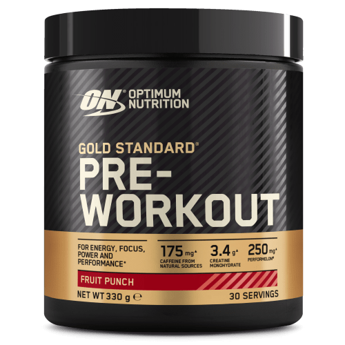 Gold Standard Pre-Work Out Pulver von Optimum Nutrition mit Fruit Punch Geschmack in der 0.33KG Packung. Optimum Nutrition – Gold Standard Pre-Workout 330 g Gold Standard Pre-Workout von Optimum Nutrition mit hochwertigen Inhaltsstoffen. Gold Standard Pre-Workout – Vorteile: 3g Creapure je Portion von 10 g verschiedenste Vitamine beigefügt koffeinhaltig leckere Geschmacksrichtungen Was ist im Gold Standard Pre-Workout enthalten? Gold Standard Pre-Workout von Optimum Nutrition beinhaltet als grundlegende Bestandteile Koffein (175 mg) aus natürlichen Quellen, CarnoSyn® Beta-Alanin, 3g Kreatin-Monohydrat (als hochwertiges Creapure®), L-Citrullin-Malat, Acetyl-L-Carnitin HCI, N-Acetyl-L-Tyrosin und eine ‚Muscle Matrix‘ mit 25 mg AstraGIN® je Messlöffel Pulver (je Portion mit 10g). Zudem sind verschiedenste Vitamine enthalten, darunter Vitamin B6 und B12, Vitamin D, Niacin und Thiamin, die eine wichtige Rolle beim Energiestoffwechsel spielen. Optimum Nutrition verabeitet bei der Herstellung nur hochwertige Zutaten. Wozu dienen die Inhaltsstoffe? Koffein gibt den Schub für Fokus und Konzentration beim Training, egal ob am Morgen oder nach einem langen Arbeitstag. Kreatin erhöht die körperliche Leistungsfähigkeit bei Schnellkrafttraining im Rahmen kurzzeitiger intensiver körperlicher Betätigung ab einer Einnahme von 3g Kreatin am Tag, diese sind in der Tagesportion vom Gold Standard Pre-Workout enthalten. Daneben sind mit Beta-Alanin. L-Citrullin-Malat und N-Acetyl-L-Tyrosin Aminosäuren als Eiweißlieferanten und L-Carnitin für den Fettstoffwechsel enthalten, um den Muskel beim Training mit Energie zu versorgen. Wer kann das Gold Standard Pre Workout nutzen? Das fruchtige Pre-Workout Getränk kann von den verschiedensten Sportlern genutzt werden. Besonders Kraftsportler und Bodybuilder verwenden verschiedenste Pre-Workout Produkte vor dem Training, um die Übungen an den Geräten sauber, konzentriert und mit Durchhaltevermögen absolvieren zu können – Ziel mehr Muskelmasse und damit verbundener Muskelaufbau. Wie nehme ich das Gold Standard Pre-Workout ein? Mische für 1 Portion einen gestrichenen Messlöffel Pulver mit 500-550ml Wasser und trinke das entstandene, fruchtige Getränk 20-40 Minuten vor dem Training. Du kannst bis zu 2 Messlöffeln Pulver verwenden, je nach eigenem Bedarf und persönlicher Verträglichkeit (achte hierbei besonders auf die zugefügte Koffeinmenge, nicht für koffeinempfindliche Personen und kurz vor dem Schlafengehen trinken).Das Pulver ist in den Geschmacksrichtungen Wassermelone, Fruchtmix und grüner Apfel erhältlich. Zutatenliste: Kreatin-Monohydrat, Beta-Alanin, Säuerungsmittel (Citronensäure, Äpfelsäure, L(+)-Weinsäure), Aromen, Trennmittel (Calciumsilicat, Siliciumdioxid), L-Citrullin, Farbstoffe (Betenrot, Beta-Carotin, Kurkumin), Acetyl-L-Carnitinhydrochlorid, Verdickungsmittel (Natrium-Carboxymethylcellulose, Xanthangummi, Carrageen), N-Acetyl-L-Tyrosin, Pyridoxinhydrochlorid, PerforMelon(R)-Wassermelonenextrakt (Citrus lanatus, Frucht), natürliches Koffein, Süßungsmittel (Sucralose, Acesulfam-K), Nicotinamid, Calcium-D-Pantothenat, Cyanocobalamin, Extrakt aus schwarzem Pfeffer (Piper nigrum, Frucht), Pteroylmonoglutaminsäure, Thiaminhydrochlorid, Cholecalciferol. Hinweis: Nahrungsergänzungsmittel sollten nicht als Ersatz für eine ausgewogene Ernährung konsumiert werden. Enthält eine Phenylalaninquelle. Kann bei übermäßigem Verzehr abführend wirken. Außerhalb der Reichweite von Kindern aufbewahren. Das neue verbesserte Pre-Workout Pulver!