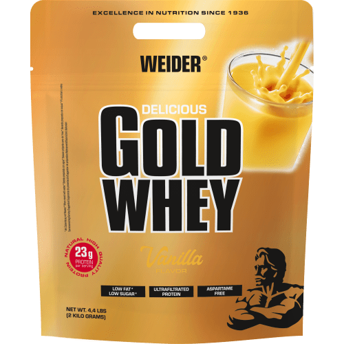 Gold Whey Protein Pulver von Weider mit Vanille Geschmack in der 2KG Packung. Weider – Gold Whey Reines Wheyprotein-Konzentrat – schnell verfügbar, in leckeren Geschmacksvarianten erhältlich und mit einem umfangreichen Aminosäurenprofil. Gold Whey von Weider – Vorteile: Wheyprotein-Konzentrat hoher Anteil an BCAAs 80% Eiweiß super lecker und cremig sehr gut löslich Was beinhaltet Whey Gold von Weider? Das Gold Whey Protein ist ein reines Whey Protein Konzentrat (98%), es sind nur wenige, weitere Zutaten für Aroma und Konsistenz zugefügt. Das enthaltene Eiweiß umfasst ein umfangreiches Aminosäurenprofil, darunter auch einen hohen BCAA Anteil. Bei Mischung mit Wasser enthält der fertige Shake nur etwa 2g Fett und 2g Zucker (variiert in den einzelnen Geschmacksrichtungen leicht), liefert aber ca. 24g Eiweiß. Warum Gold Whey von Weider? Gold Whey gehört weltweit zu den bekanntesten und beliebtesten Whey Proteinen. Sportler schätzen die schnelle Eiweißzufuhr insbesondere nach dem Sport und wie man es von Weider kennt, ist auch das Gold Whey super lecker und cremig. Zudem ist das Pulver sehr gut löslich. Hergestellt in Ultrafiltration kommt das Gold Whey Protein auf einen Eiweißgehalt von ca. 80% und liefert über 20% BCAA (verzweigtkettige Aminosäuren). Der geringe Kohlenhydrat- und Fettanteil macht das Whey auch interessant für eine kohlenhydratreduzierte und eiweißeiche Ernährung und kann diese optimal ergänzen.Wheyprotein zählt zu den Standardsupplements für Bodybuilder, Fitnessathleten und Kraftsportler und ist ideal für Muskel- und Kraftaufbauphasen. Wie wird das Gold Whey genutzt? Du kannst am Tag 1-2 Shakes zu Dir nehmen, an Trainingstagen vorzugsweise einen nach dem Training und evtl. einen Shake am Morgen nach dem Aufstehen. Für 1 Portion mische 30g Weider Gold Whey Pulver mit 300ml fettarmer Milch oder Wasser in einem Shaker, direkt nach Herstellung verzehren. Reines Wheyprotein-Konzentrat – schnell verfügbar, in leckeren Geschmacksvarianten erhältlich und mit einem umfangreichen Aminosäurenprofil.