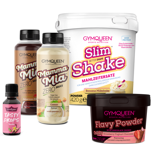 GQ 1×1 GYMQUEEN. 1Wenn du dein Gewicht reduzieren möchtest, solltest du zwei Hauptmahlzeiten pro Tag durch einen Slim Shake ersetzen. Ist es dein Ziel, dein Gewicht zu halten, genügt es, eine Hauptmahlzeit durch einen Abnehm-Shake pro Tag zu ersetzen. Dazu solltest du die Zubereitungsempfehlung einhalten. Achte auf eine ausreichende Flüssigkeitsaufnahme, am besten in Form von Wasser. Der Shake erfüllt nur im Rahmen einer kalorienreduzierten Ernährung den angestrebten Zweck, deshalb solltest du darauf achten, dass andere Lebensmittel Teil der Ernährung sind. Bei Langzeitverwendung und Allergien wird empfohlen ärztlichen Rat einzuholen. Nährwerte für eine Portion Slim Shake Vanilla mit Milch (1,5 % Fett): Durchschnittliche Nährwerte pro Portion (30 g Pulver + 275 ml Milch (1,5 % Fett)) Energie 1031 kJ / 246 kcal Fett 7,5 g davon gesättigte Fettsäuren 3,9 g Kohlenhydrate 23 g davon Zucker 17 g Ballaststoffe 1,2 g Eiweiß 21 g Salz 0,66 g Vitamine und Mineralstoffe pro Portion (30 g Pulver + 275 ml Milch (1,5 % Fett)) % Nährstoffreferenzwerte Vitamin A 284 µg 35 % Vitamin D 2 µg 34 % Vitamin E 4 mg 34 % Vitamin K 25 µg 34 % Vitamin C 28 mg 35 % Thiamin 0,4 mg 37 % Riboflavin 1 mg 46 % Niacin 5 mg 34 % Vitamin B6 1 mg 36 % Folsäure 74 µg 37 % Vitamin B12 1,3 µg 52 % Biotin 17 µg 34 % Pantothensäure 2 mg 34 % Kalium 916 mg 46 % Calcium 273 mg 34 % Phosphor 740 mg 106 % Magnesium 162 mg 43 % Eisen 19 mg 134 % Zink 3 mg 34 % Kupfer 0,3 mg 35 % Mangan 1 mg 34 % Selen 19 µg 35 % Jod 50 µg 34 % Neues Jahr, neue Vorsätze! Und dank unserem GYMQUEEN 1×1 Bundle kannst du in nur drei Schritten ganz einfach abnehmen1 und Zucker sparen2. Ersetze mit dem unglaublich leckeren Slim1 Shake 1-2 Mahlzeiten pro Tag und werte mit unserem Flavy Powder langweilige Speisen wie Porridge, Quark oder Skyr auf, während du obendrein Zucker einsparst2. Spare zusätzlich Zucker und Kalorien, indem du herkömmliche Saucen mit zwei Mamma Mia Zero Saucen deiner Wahl austauschst.Lass deinen Vorsätzen nichts mehr im Wege stehen und bestelle jetzt das GYMQUEEN 1×1 Bundle mit den Sorten deiner Wahl! BITTE BEACHTE : Aufgrund unseres Design Umstellungsprozesses kann es sein, dass du den Slim Shake noch im alten Design erhältst.