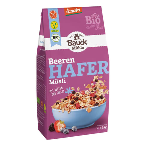 Hafermüsli mit Beeren glutenfrei bio Bauckhof. Hafermüsli mit Beeren glutenfrei bio von Bauckhof Das Hafermüsli beinhaltet leckere Reisflakes, glutenfreien Haferflocken, Korinthen, Apfelstücken, Brombeeren, Heidelbeeren und Erdbeeren. Daraus entsteht ein herausragender Cerealien-Mix. Alle weiteren Zutaten kommen ebenfalls aus ökologischem Bio-Anbau. Eco control number: DE-ÖKO-007 Herausragender Cerealien-Mix mit feinen Beeren!