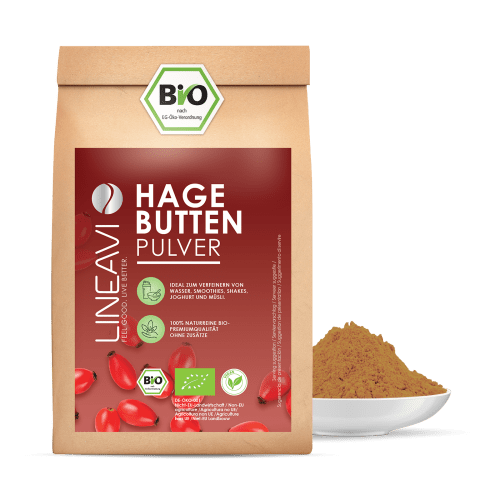 Hagebuttenpulver bio Pulver von LINEAVI. Die Hagebutte ist die leuchtend rote Frucht verschiedener Wildrosenarten, besonders bekannt durch die Heckenrose (Rosa canina). Schon seit Jahrhunderten wird sie in der Volksheilkunde geschätzt – und das nicht ohne Grund: Hagebutten sind reich an Vitamin C, enthalten wertvolle sekundäre Pflanzenstoffe wie Flavonoide sowie natürliche Ballaststoffe und Fruchtsäuren. Durch schonende Trocknung und feines Vermahlen entsteht Hagebuttenpulver – eine praktische Form, um die Kraft der Hagebutte in den Alltag zu integrieren. Es überzeugt mit einem angenehm säuerlich-fruchtigen Geschmack und eignet sich ideal zum Verfeinern von Müsli, Smoothies, Joghurts oder Shakes. In hochwertiger Bio-Qualität ist Hagebuttenpulver frei von Zusätzen und stammt aus kontrolliert ökologischem Anbau. Ob als natürlicher Vitamin-C-Lieferant oder einfach als fruchtige Ergänzung – Hagebuttenpulver ist eine vielseitige Zutat aus der Natur, die viel zu bieten hat. Eco control number: DE-ÖKO-001 Unser Bio-Hagebuttenpulver ist eine wahre Schatztruhe der Natur. Die leuchtend rote Frucht aus kontrolliert biologischem Anbau überzeugt mit ihrem säuerlich-fruchtigen Geschmack und eignet sich ideal zum Verfeinern von Müsli, Joghurt, Säften oder Smoothies. Ein natürlicher Begleiter für einen frischen Start in den Tag – in bester Bio-Qualität.