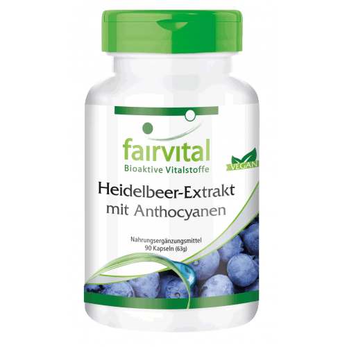 Heidelbeer-Extrakt mit Anthocyanen Kapseln von Fairvital. Heidelbeer-Extrakt mit Anthocyanen von Fairvital Blaubeeren zeichnen sich besonders durch ihren hohen Gehalt an Vitaminen, Mineralstoffen und Spurenelementen aus. Zu ihnen gehören Vitamin A, B-Vitamine, Vitamin C, Calcium, Eisen, Kalium, Magnesium und Zink. Des Weiteren sind sie reich an Polyphenolen (Flavonoide und Phenolsäuren), Proanthocyanidinen, Anthocyanen, Fruchtsäuren und Pektinen. Reich an Polyphenolen (Flavonoide und Phenolsäuren), Proanthocyanidinen, Anthocyanen, Fruchtsäuren und Pektinen.