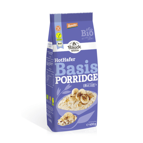 Hot Hafer Basis demeter Bauckhof. Hot Hafer Basis demeter von Bauckhof Für den Haferbrei werden die Haferflocken speziell verarbeitet. Deshalb lässt sich unser Hot Hafer einfach und schnell zubereiten und hat eine optimale Konsistenz. Der Hafer für diesen kontrolliert glutenfreien Haferbrei wird frei von Glutenverunreinigungen angebaut und verarbeitet. Die meisten Menschen mit einer Glutenunverträglichkeit können glutenfreien Hafer in ihre Ernährung mit einbeziehen, da sich die Eiweißstruktur des Hafers von der von Weizen, Roggen, Dinkel und Gerste unterscheidet. Es wird empfohlen, glutenfreie Haferprodukte zunächst langsam und schrittweise in einen glutenfreien Speiseplan zu integrieren. Hafer hat von Natur aus ein ausgewogenes Verhältnis an verschiedenen Nährstoffen: – Hafer enthält von Natur aus Vitamin B1 – Der Eisengehalt im Hafer ist höher als bei anderen Getreidearten – Hafer enthält lösliche Ballaststoffe, die den für Hafer typischen Schleim bilden Cholesterinbewusste Ernährung mit Hafer Erwiesenermaßen senken Hafer-Beta-Glucane den Cholesterinspiegel im Blut. Hohe Cholesterinwerte zählen zu den Risikofaktoren bei der Entstehung koronarer Herzkrankheiten. Diese förderliche Wirkung wird erzielt bei einer täglichen Aufnahme von 3 g Hafer-Beta-Glucan (entspricht 80 g Hot Hafer. Eine Portion Hot Hafer entspricht 50 g). Eine abwechslungsreiche und ausgewogene Ernährung sowie eine gesunde Lebensweise mit ausreichend Bewegung sind grundlegende Voraussetzungen für deine Gesundheit. Auf der Verpackung findest du neben der klassischen Zubereitungsanleitung auch eine schnelle Zubereitung sowie eine Zubereitungsanleitung für die Mikrowelle. Der Hot Hafer trägt als Zeichen für Fairness bei heimischen Bio-Lebensmitteln das FairBio-Logo. Es steht für kurze Transportwege, Transparenz und langfristige, partnerschaftliche Beziehungen. Eco control number: DE-ÖKO-007 Glutenfreie Hafer-Flockenmischung zur Zubereitung eines warmen Haferbreis.