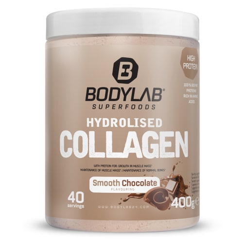 Hydrolised Collagen Pulver von Bodylab24 mit Smooth Chocolate Geschmack in der 0.4KG Packung. Kollagen gehört zu den körpereigenen Proteinen und ist vorwiegend in den Knochen, der Haut, den Blutgefäßen, in Zähnen, Sehnen und Knorpel zu finden. Was beinhaltet das Bodylab24 Hydrolised Collagen? Das feine und sehr gut wasserlösliche Pulver besteht im Geschmack NEUTRAL zu 100 % Kollagenhydrolysat und liefert damit 93 % Protein. Die Varianten mit Geschmack enthalten zwischen 84 und 93 % Protein, Aroma sorgt für Geschmack und Süßstoff für Süße. Eine Tagesdosierung umfasst eine 10 g Pulverportion, die in Wasser, Fruchtsaft oder ein anderes Getränk (auch ein Heißgetränk) nach Wahl eingerührt werden kann. Das Pulver enthält ein umfangreiches Aminosäureprofil, Konservierungs- oder weitere Füllstoffe sind nicht zugefügt. Warum Bodylab Hydrolised Collagen? Die Vorteile im Überblick: – bis 9,3 g Protein je Tagesdosierung (10 g) (je nach Geschmack) – Kollagen zählt zu den körpereigenen Proteinen und wird besonders gut vom Körper verwertet – fast fett- und kohlenhydratfrei (jeweils unter 0,5g je Portion) – in mehreren Geschmacksvarianten oder neutral verfügbar – laktosefrei – als feines Hydrolysatpulver perfekt löslich – 100% aus Rind hergestellt Kollagen ist ein Strukturprotein und reich an wichtigen Aminosäuren, darunter essentielle (inklusive der BCAA: Leucin, Isoleucin und Valin) und nicht essentielle Aminosäuren (auch Glutamin). Durch ein spezielles Herstellungsverfahren wird Kollagen zu einem feinen Hydrolysatpulver verarbeitet, ist dadurch sehr gut löslich und für den Körper besonders schnell verwertbar. Sportler verwenden Hydrolised Collagen als Zusatzsupplement zur Anreicherung ihrer Proteinversorgung. Durch den hohen Proteinanteil im Pulver ist nur eine geringe Dosierung nötig, die schon mit einem Glas Wasser, Fruchtsaft oder auch im Kaffee oder Tee eingerührt für ein zusätzliches Eiweißplus sorgen kann. Die Portion kann rund ums Training oder zu anderen Zeiten des Tages als zusätzliche Proteinversorgung beim Muskelaufbau und -erhalt genutzt werden. Durch die sehr gute und einfache Löslichkeit in Wasser kann das Pulver problemlos ohne Shaker verwendet werden. Einfach einrühren – fertig. Je nach persönlichen Vorlieben kann Hydrolised Collagen mit Wasser, Fruchtsaft, Milch, eine Milchvariante oder einem anderen Kaltgetränk gemischt oder zu Kaffee, Tee oder einem anderen Heißgetränk zugefügt werden. Unser reines Kollagenhydrolysat mit meist mehr als 9 g Protein je 10g Tagesdosis – reich an Aminosäuren, wenig Fett und Kohlenhydrate je Portion.Ideal als Proteinanreicherung zu einem Getränk Deiner Wahl – für Kaltgetränke geeignet, ebenso als Kaffeezusatz oder für andere Heißgetränke.