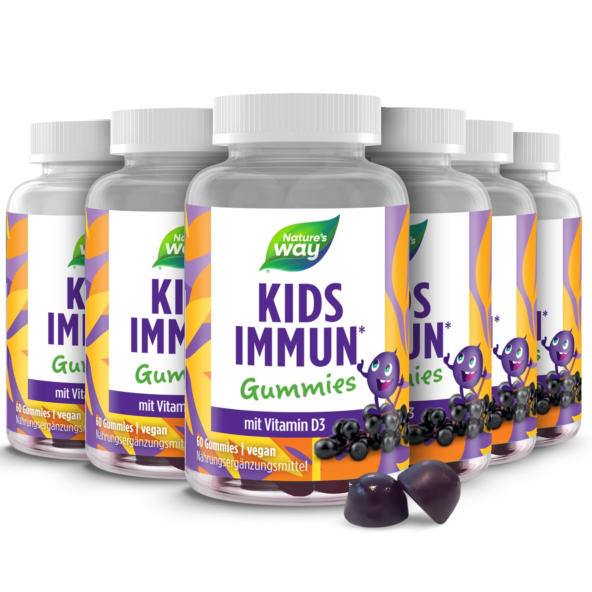 Vitamine für Kinder: Möchtest du sicherstellen, dass das Immunsystem deiner Kinder gesund und widerstandsfähig bleibt? Unsere Nature’s Way Kids Immun Gummies machen es einfach und lecker, das Immunsystem deiner Kinder mit Vitamin D zu unterstützen.¹ Neben Vitamin D3 enthält die speziell für Kinder entwickelte Formel Vitamin C, Selen und Zink. Abgerundet mit einem natürlichen Holunderbeer-Extrakt, schmecken die Kids Immun Gummies dazu lecker fruchtig. Die Nährstoffaufnahme wichtiger Vitamine und Mineralstoffe wird so Tag für Tag zum richtigen Kinderspiel.. – 60 Gummies mit Holunderbeeren-Geschmack. – Vitamine für Kinder ab 4 Jahren. – mit Vitamin D3 für das Immunsystem von Kindern¹ und on top Vitamin C, Selen und Zink. – vegan, frei von Gluten, Laktose & Gelatine. Entdecke mit Kids Immun den Allrounder für die kalte Jahreszeit und versorge deine Familie mit wichtigen Nährstoffen in Form von Vitamin Gummibärchen, die alle gerne einnehmen. Kinder ab 4 Jahren erhalten 1 Gummy täglich (entspricht 400 I.E./10 µg Vitamin D3), für Kinder ab 13 Jahren empfehlen wir zwei Gummies am Tag. So reicht eine Dose bis zu zwei Monate.. ¹Vitamin D trägt zu einer normalen Funktion des Immunsystems von Kindern bei