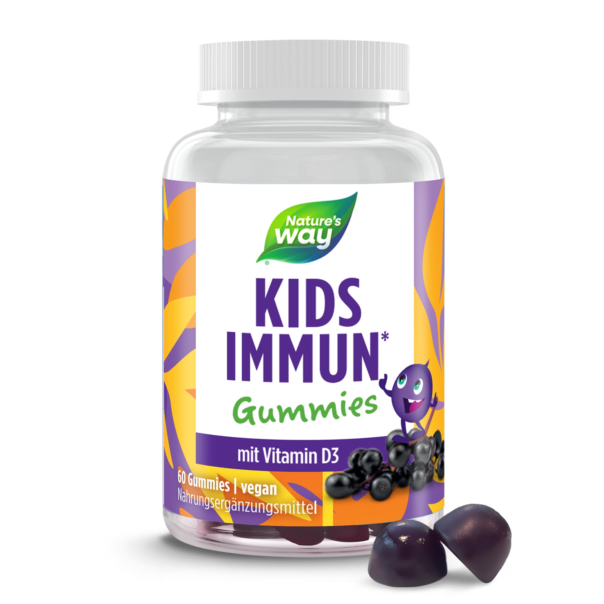 Vitamine für Kinder: Möchtest du sicherstellen, dass das Immunsystem deiner Kinder gesund und widerstandsfähig bleibt? Unsere Nature’s Way Kids Immun Gummies machen es einfach und lecker, das Immunsystem deiner Kinder mit Vitamin D zu unterstützen.¹ Neben Vitamin D3 enthält die speziell für Kinder entwickelte Formel Vitamin C, Selen und Zink. Abgerundet mit einem natürlichen Holunderbeer-Extrakt, schmecken die Kids Immun Gummies dazu lecker fruchtig. Die Nährstoffaufnahme wichtiger Vitamine und Mineralstoffe wird so Tag für Tag zum richtigen Kinderspiel.. – 60 Gummies mit Holunderbeeren-Geschmack. – Vitamine für Kinder ab 4 Jahren. – mit Vitamin D3 für das Immunsystem von Kindern¹ und on top Vitamin C, Selen und Zink. – vegan, frei von Gluten, Laktose & Gelatine. Entdecke mit Kids Immun den Allrounder für die kalte Jahreszeit und versorge deine Familie mit wichtigen Nährstoffen in Form von Vitamin Gummibärchen, die alle gerne einnehmen. Kinder ab 4 Jahren erhalten 1 Gummy täglich (entspricht 400 I.E./10 µg Vitamin D3), für Kinder ab 13 Jahren empfehlen wir zwei Gummies am Tag. So reicht eine Dose bis zu zwei Monate.. ¹Vitamin D trägt zu einer normalen Funktion des Immunsystems von Kindern bei