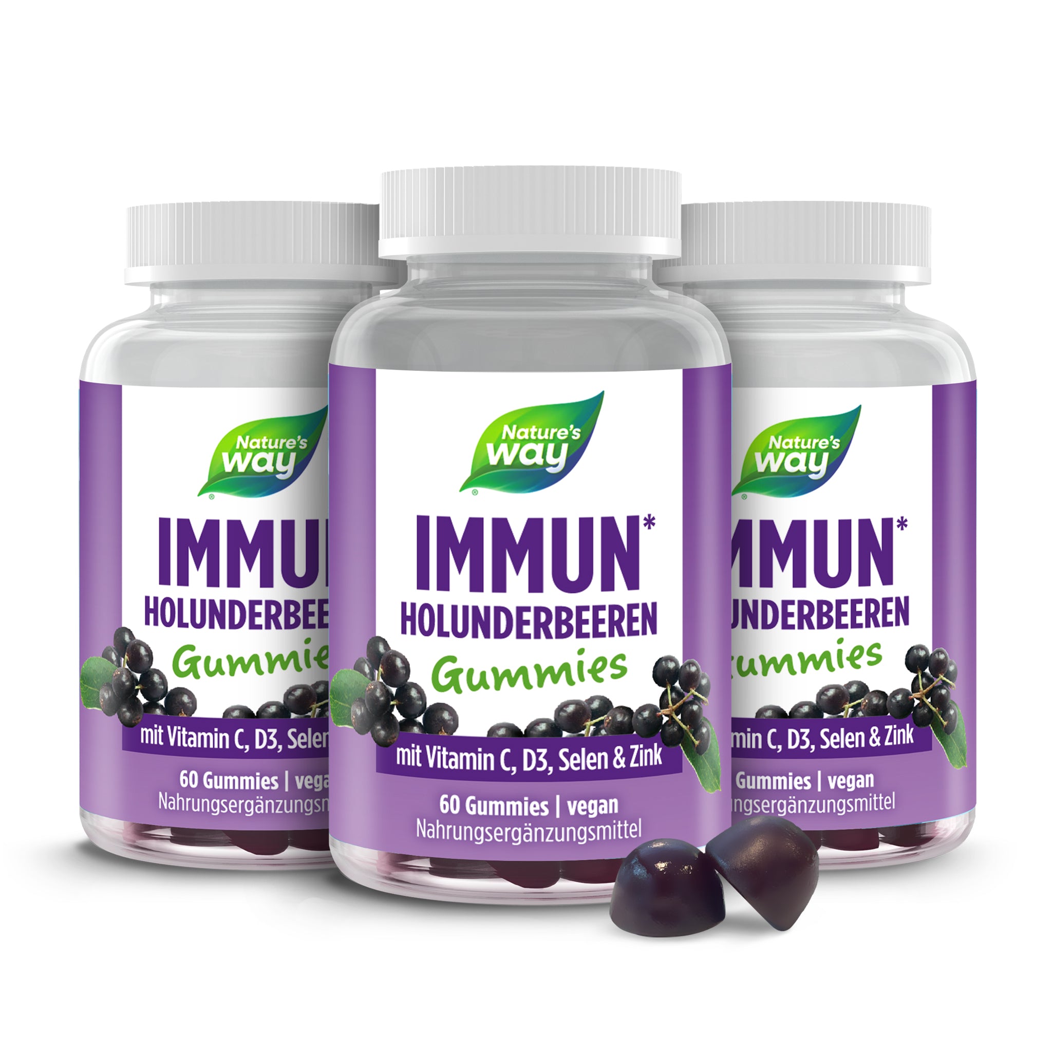 Vitamine fürs Immunsystem: Möchtest du dein Immunsystem auf effiziente und zugleich leckere Weise unterstützen? Unsere Nature’s Way Immun Holunderbeeren Gummies enthalten eine 4in1 Immun-Formel, die von Ernährungswissenschaftlern konzipiert wurde. Sorgfältig ausgewählte Nährstoffe wie Vitamin C, Vitamin D3, Zink und Selen sorgen dafür, dass dein Immunsystem unterstützt wird¹ – all das in nur zwei Gummies täglich!. Ein natürlicher Holunderbeeren-Extrakt, der auf 13% Anthocyane standardisiert ist, ergänzt die Formel perfekt und gibt den Gummies ihren fruchtigen Geschmack.. Vitamin C trägt zu einer normalen Funktion des Immunsystems bei, schützt die Zellen vor oxidativem Stress⁵ und unterstützt deinen Energiestoffwechsel². Vitamin D3 unterstützt ebenfalls die normale Funktion des Immunsystems⁴. Selen und Zink tragen dazu bei, Zellen vor oxidativem Stress zu schützen³.. – 60 Gummies mit Holunderbeeren-Geschmack. – 4in1 Immun Formel¹ mit Vitamin C, D3, Selen und Zink. – plus standardisiertem Schwarze Holunderbeeren-Extrakt. – vegan, frei von Gluten, Laktose & Gelatine. Gib deinem Körper in der kalten Jahreszeit etwas extra Support und genieße gleichzeitig den fruchtigen Geschmack unserer Immun Holunderbeeren Gummies. Schon 2 Gummies täglich reichen, um deinen Körper mit vielen wichtigen Nährstoffen zu unterstützen.. ¹Vitamin C, Vitamin D, Selen und Zink tragen zu einer normalen Funktion des Immunsystems bei. ²Vitamin C trägt zu einem normalen Energiestoffwechsel & zur Verringerung von Müdigkeit bei. ³Selen und Zink tragen dazu bei, die Zellen vor oxidativem Stress zu schützen. ⁴Vitamin D trägt zu einer normalen Funktion des Immunsystems bei. ⁵Vitamin C trägt dazu bei, die Zellen vor oxidativem Stress zu schützen