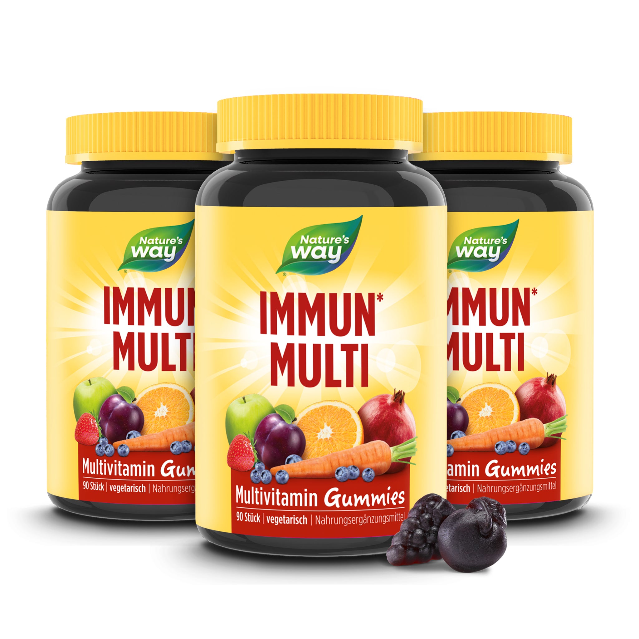 Unterstütze dein Immunsystem auf die leckere Art! Die fruchtigen Immun Multivitamin Gummies schmecken saftig nach Kirsche und Trauben und schon 1-2 Stück pro Tag supporten dein Immunsystem mit den Vitaminen A, C, D und Zink¹. On top enthalten die Gummies standardisierten Holunderbeeren-Extrakt mit Anthocyanen (Flavonoiden). Vitamin E schützt deine Körperzellen vor oxidativem Stress². Mit zahlreichen Nährstoffen sind unsere Immun Gummibärchen Multivitamin dein täglicher Begleiter zur Unterstützung deiner Gesundheit in der kalten Jahreszeit¹.. – 90 Immun Multivitamin-Gummies mit Kirsch- und Traubengeschmack. – Mit Holunderbeeren-Extrakt mit Anthocyanen. – Mit dem Plus aus 26 Obst- und Gemüsesorten. – Vegetarisch und frei von Gelatine, Gluten und Laktose. Tipp: Ergänzend zu den Nature’s Way Immun Multivitamin Gummies empfehlen wir dir unsere Vitamin B Komplex Gummies, da sich die Nährstoffe der beiden Produkte sehr gut ergänzen. Die beiden Produkte gibt’s im praktischen Vorteils-Set.. ¹Vitamin A, C, D und Zink tragen zu einer normalen Funktion des Immunsystems bei. ²Vitamin E trägt dazu bei, die Zellen vor oxidativem Stress zu schützen