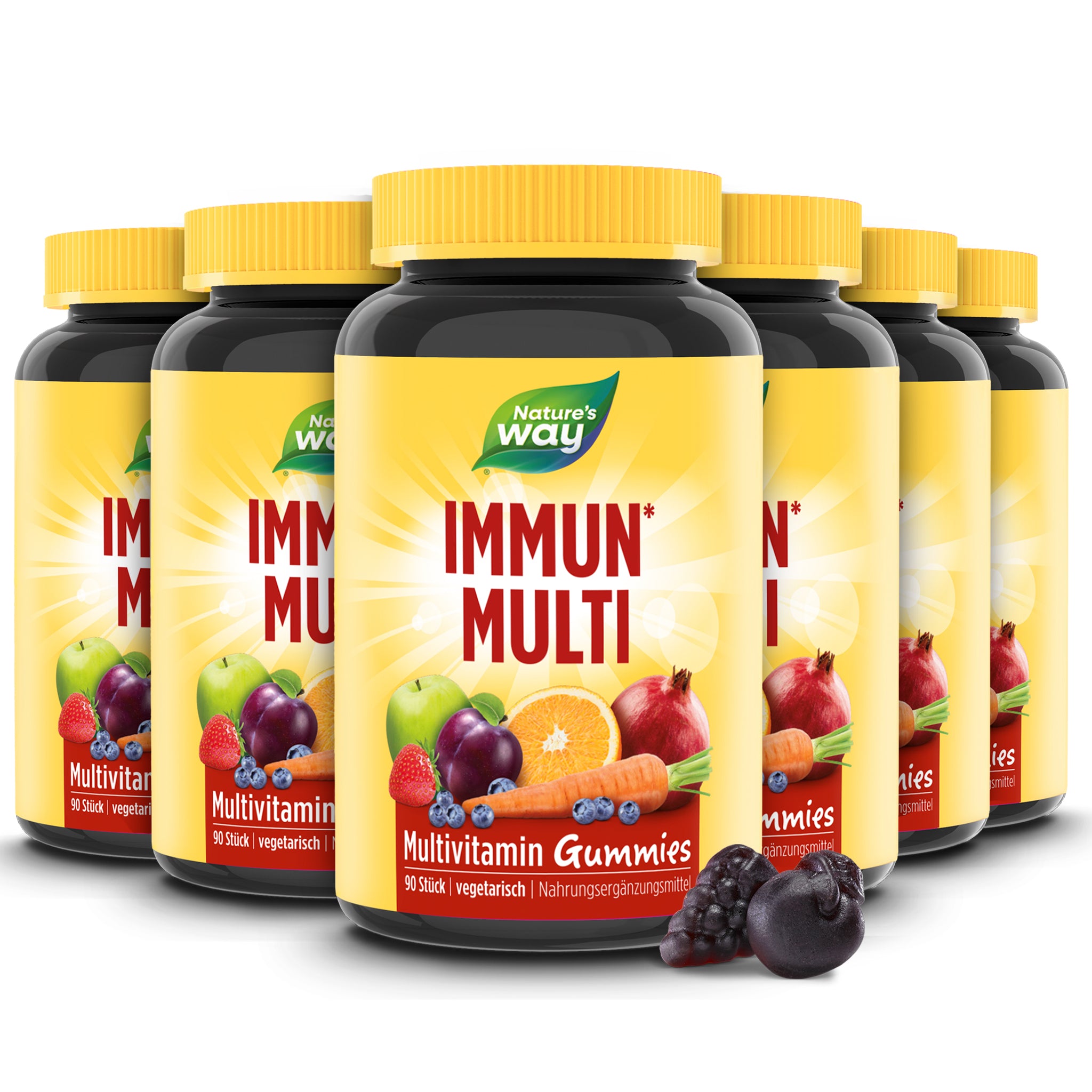 Unterstütze dein Immunsystem auf die leckere Art! Die fruchtigen Immun Multivitamin Gummies schmecken saftig nach Kirsche und Trauben und schon 1-2 Stück pro Tag supporten dein Immunsystem mit den Vitaminen A, C, D und Zink¹. On top enthalten die Gummies standardisierten Holunderbeeren-Extrakt mit Anthocyanen (Flavonoiden). Vitamin E schützt deine Körperzellen vor oxidativem Stress². Mit zahlreichen Nährstoffen sind unsere Immun Gummibärchen Multivitamin dein täglicher Begleiter zur Unterstützung deiner Gesundheit in der kalten Jahreszeit¹.. – 90 Immun Multivitamin-Gummies mit Kirsch- und Traubengeschmack. – Mit Holunderbeeren-Extrakt mit Anthocyanen. – Mit dem Plus aus 26 Obst- und Gemüsesorten. – Vegetarisch und frei von Gelatine, Gluten und Laktose. Tipp: Ergänzend zu den Nature’s Way Immun Multivitamin Gummies empfehlen wir dir unsere Vitamin B Komplex Gummies, da sich die Nährstoffe der beiden Produkte sehr gut ergänzen. Die beiden Produkte gibt’s im praktischen Vorteils-Set.. ¹Vitamin A, C, D und Zink tragen zu einer normalen Funktion des Immunsystems bei. ²Vitamin E trägt dazu bei, die Zellen vor oxidativem Stress zu schützen