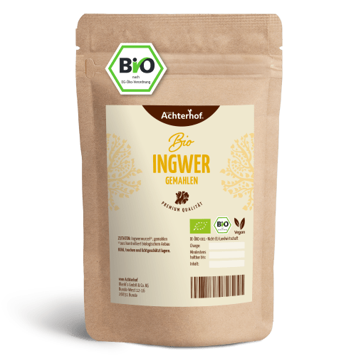 Ingwer gemahlen Bio vom Achterhof. Hochwertiges Ingwer Pulver in bester Qualität Die Würzkraft aus der Tiefe der Erde Sie wird hierzulande immer bekannter, die Ingwerwurzel. Sicher hast auch du sie schon einmal im Supermarkt liegen sehen, dich vielleicht aber noch nicht so recht an ihre Verarbeitung herangetraut. Dabei steckt in der unscheinbaren Wurzel der krautig wachsenden Ingwerpflanze echte Würz-Power. Ingwer schmeckt brennend scharf, hat aber gleichzeitig auch süße Komponenten. Das Aroma ist einmalig. Gemahlenes Ingwerpulver kaufen solltest du nun, wenn du die Vorteile des attraktiven Geschmacksprofils mit einer einfachen Handhabung in deiner Küche kombinieren möchtest. Gemahlen ist das Pulver der Ingwerwurzel gleich einsatzbereit. Wer schnell loslegen möchte, sollte also Ingwerpulver kaufen und keine Zeit verlieren. Das kannst du übrigens gleich hier online tun. Ab in den Warenkorb mit der gewünschten Menge Ingwerpulver und direkt danach zur Kasse gehen. Einfacher kann Ingwerpulver kaufen nicht sein! Ingwer: Nicht nur in Asien ein Geschmacksgarant Ingwerpulver kaufen steht natürlich in erster Linie für Liebhaber der asiatischen Küche ganz oben auf dem Einkaufszettel. Currys, Chutneys oder Reisgerichte werden mit Ingwer aromatisiert. Magst du es würzig, aber nicht zu scharf, ist Ingwerpulver kaufen die richtige Entscheidung. Das Pulver enthält den vollen Geschmack, ist aber deutlich sanfter als die frisch geriebene Wurzel. Wer lieber mild speist, muss auf den besonderen Ingwer-Geschmack also keineswegs verzichten. Hast du schon einmal Ginger Ale getrunken? Und wusstet du auch, dass die süße Limonade dem Ingwer ihren Namen verdankt? Ingwerpulver kaufen lohnt sich nicht nur für asiatische Gerichte, sondern auch für Getränke. Sei es Ginger Ale, oder der in Arabien begehrte Ingwertee. Die besonderen Eigenschaften der kraftvollen Wurzel wird gerade in heißen Ländern sehr geschätzt. Dort reicht man Ingwertee zu allen Mahlzeiten des Tages, weil es einfach wunderbar schmeckt. Die unglaubliche Vielfalt des Ingwers Fürs Ingwerpulver kaufen sprechen nun bereits zwei gute Gründe. Aber es gibt noch so viele mehr. Lust auf den gewissen Kick in Fischgerichten? Gib etwas Ingwerpulver in deine Soße und Seelachs, Forelle oder Heilbutt schmecken gleich noch mal so gut. Oder liebst du Gebäck? Nicht nur Zimt, Vanille und Kardamom eignen sich für die süßen Sünden. Ingwerpulver kaufen passt ebenso zur Weihnachtsbäckerei. Damit nicht nur Süße, auf dem Plätzchenteller liegt, sondern auch würziges Aroma. Sorge für Abwechslung in der Adventszeit und versuche es doch einmal mit Ingwer-Plätzchen! Dass Ingwer hervorragend zu Naschwerk passt, haben auch die Süßwarenkonzerne bereits entdeckt. Mit Schokolade überzogener kandierter Ingwer ist heute keine Seltenheit mehr. Aber du kannst selbst ganz neue Genüsse kreieren. Einfach Ingwerpulver kaufen und ausprobieren. Im Kuchen, in den Plätzchen, zu Obst, in der Bratensoße oder der vegetarischen Gemüsepfanne. Die Wurzel hat es in sich, probiere es aus ! Eco control number: DE-ÖKO-001 Die Knolle aus der Ingwerpflanze hat es wahrlich in sich und der Geschmack ist unverwechselbar – fruchtig scharf mit einer leichten Zitrusnote. Das gemahlene Pulver ist etwas milder im Geschmack als die frisch geriebene Wurzel, eignet sich hervorragend für Currys, Chutneys oder Reisgerichte, aber auch für Getränke wie Limonaden, Tee oder den klassischen Ginger Ale.