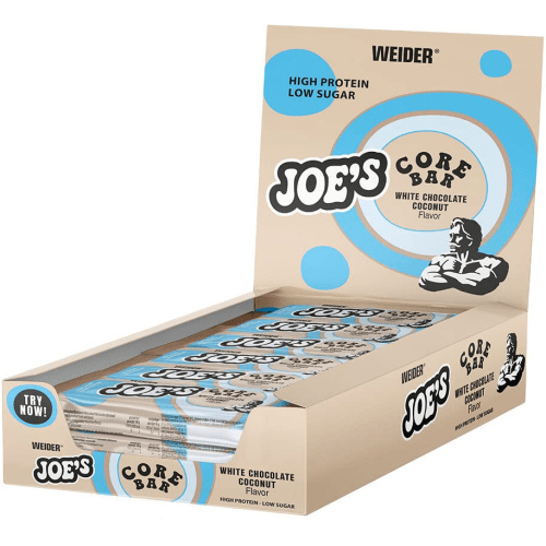 JOE’s Core Bar Riegel von Weider mit White Chocolate Coconut Geschmack in der 0.54KG Packung. JOE’S Core Bar von Weider Der JOE’s CORE Bar ist eine Kombination aus einem cremig-weichen Proteinkern und einer leckeren Hülle aus Milchschokolade, mal verfeinert mit Haselnüssen oder auch mit Kokosrapseln. Mit seinen 176 kcal ist er eine absolut süße Versuchung und das bei gerade einmal 1,7g Zucker und ganzen 31% Eiweiß pro Riegel! Somit passt er perfekt in deinen Ernährungsplan und die Proteine können zu deinen Muskelaufbau und -erhalt beitragen. Eine absolut süße Versuchung mit weichem Proteinkern!