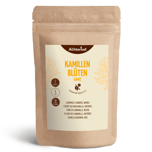 Kamillenblüten ganz vom Achterhof. Feinste Kamillenblüten großköpfig Die Kamille zählt nicht zu unrecht zu den bekanntesten Pflanzen in unseren Breitengraden. Schon vor Jahrtausenden setzten die Griechen und Römer die Kamille ein. TIP: In Verbindung mit Honig harmonisiert die Kamille hervorragend. Kamillenblüten kaufen: Investition in Genuss und Wohlbefinden An welchen Tee denkst du zuerst, wenn du an nasskalte Herbsttage denkst? Es geht dir vielleicht wie vielen anderen und dir kommt an erster Stelle der Kamillentee in den Sinn. Die positiven Eigenschaften der Matricaria, wie die Kamille botanisch heißt, ist wohl unumstritten. Aber hast du auch schon einmal daran gedacht, dir deinen eigenen Tee aus Kamillenblüten herzustellen? Das ist kinderleicht. Nicht wesentlich komplizierter als einen Beutel in die Teetasse zu hängen, aber deutlich aromatischer. Kamillenblüten kaufen kannst du ganz einfach online. Wie du deinen Kamillentee einfach zum Genießen zauberst, verraten wir dir. Außer an Kamillenblüten zu kaufen, musst du an nichts weiter denken. Übergieße einen gehäuften Esslöffel, das entspricht etwa vier Gramm Kamillenblüten, mit heißem Wasser und lasse den Sud ca. acht bis zehn Minuten ziehen. Nun kannst du das Aroma der Matricaria sofort genießen. Ein Tipp am Rande: Ein wenig Honig versüßt den Geschmack nochmal enorm! Dich überrascht der angenehm milde, fast den Hals streichelnde Geschmack? So schmeckt frischer Tee, wenn man sich zum Kauf von Kamillenblüten entschieden hat. Wesentlich aromatischer als der teuerste aufgegossene Beutel nur sein kann. Nicht fad, wie er dir vielleicht aus Kindheitstagen in Erinnerung geblieben ist, sondern hocharomatisch. Eine gute Alternative für den, der den Eigengeschmack von Salbei oder Pfefferminze nicht mag. Doch Kamillenblüten kaufen bringt dir nicht nur ein Mehr an Genuss, sondern ist auch eine günstige Sache. Die ganzen Blütenköpfe sind wesentlich vielfältiger einsetzbar, als der bekannte Teebeutel. Kamillenblüten kaufen lohnt sich gleich doppelt. Ob als Tee oder als herrlicher Aufguss. Großes Potenzial im Köpfchen: die Kamille Ob im Tee, in der Salbe, oder als Zusatz im Badewasser; Kamillenblüten kaufen macht sich in vielfacher Hinsicht bezahlt. Nutze das große Potential der kleinen Blüten doch auch zu deinem Vorteil! Die Blütenköpfe der Kamille sind kleine wunderschöne Naturwunder. Die alten Ägypter haben die Pflanze als Blume des Sonnengottes angesehen. Die großköpfigen Blütenköpfe sind vielseitig einsetzbar, und werden gerne für einen Tee oder ein wohltuendes Bad verwendet. Schon gewusst – das Produkt gibt es auch in Bio-Qualität .