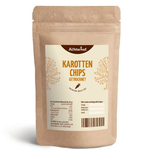 Karottenchips vom Achterhof. Die Karotte oder auch Möhre genannt, ist ein beliebtest Gemüse das Verwendung in Saucen, Salaten, Säften und Kuchen findet, denn sie schmecken natürlich süß, enthalten wichtige Vitamine und Nährstoffe und sind dabei noch kalorienarm. Das schafft die optimale Grundlage für die knackigen Karotten Chips vom Achterhof und bietet somit die perfekte Alternative für fettige und kohlenhydratreiche Kartoffel Chips.