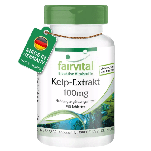 Kelp-Extrakt 100mg Tabletten von Fairvital. Kelp-Extrakt 100mg von Fairvital Die Kelp-Alge wird vor allem wegen ihres hohen natürlichen Jodgehalts geschätzt. Jod ist ein essentielles Spurenelement, das regelmäßig über die Nahrung aufgenommen werden muss. Kelp ist eine Braunalge aus dem atlantischen Ozean, die eine Vielzahl an Vitalstoffen enthält, beispielsweise Vitamin B2, Niacin, Cholin, Carotin, Alginsäure, Jod, Kalzium, Phosphor, Eisen, Kalium, Magnesium, Schwefel, Kupfer, Zink und Mangan. Der in diesem Produkt verwendete Kelp-Extrakt wurde auf 0,15% Jod standardisiert. Pro Tablette sind 150µg Jod enthalten, was 100% des Tagesbedarfs von Erwachsenen sowie Kindern über 12 Jahren entspricht. Die Kelp-Alge wird vor allem wegen ihres hohen natürlichen Jodgehalts geschätzt.