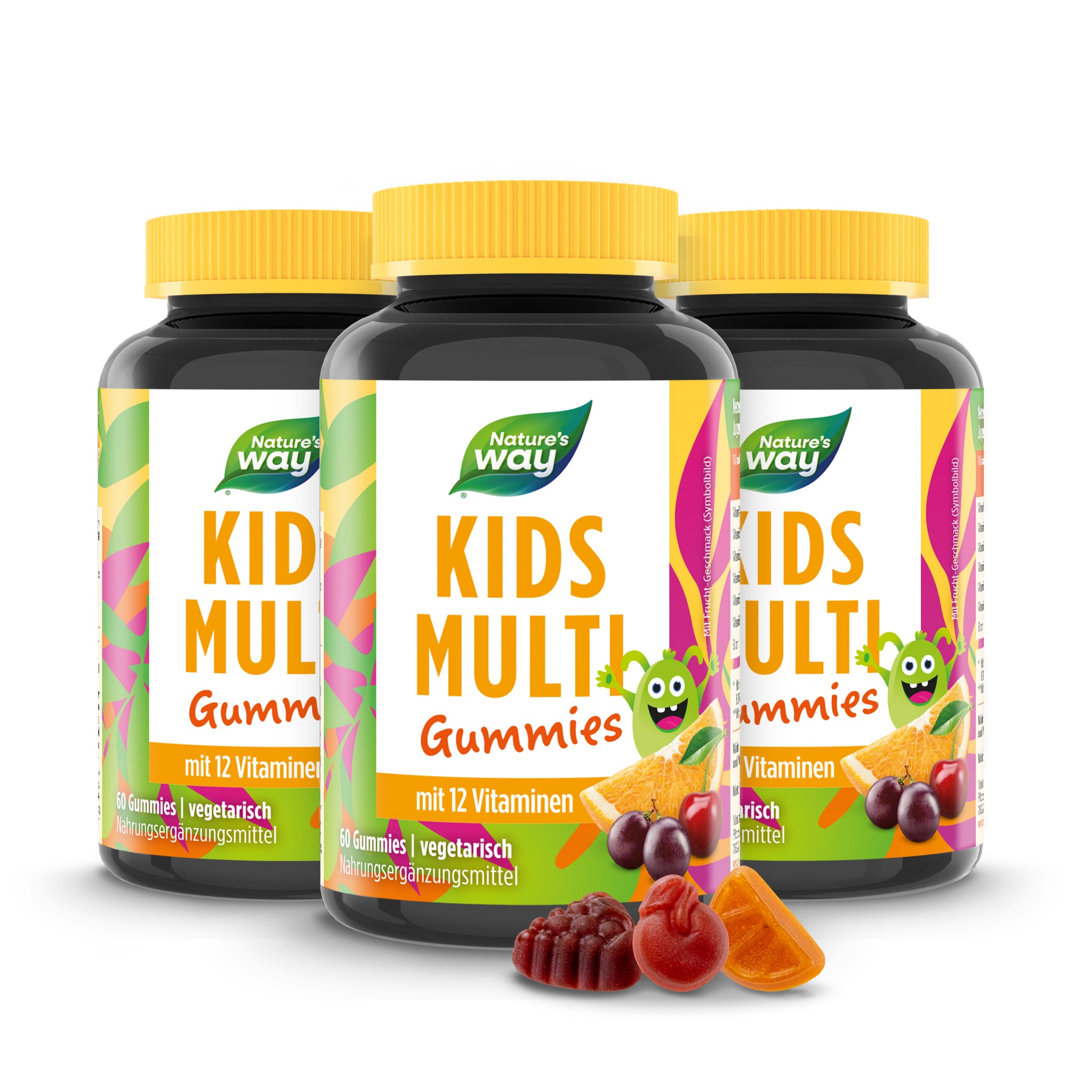 Du suchst einen Weg, wie deine Kinder täglich an viele wichtige Vitamine und Spurenelemente kommen? Wie wäre es mit einem Multivitamin für Kinder? Die Kids Multi Gummies von Nature’s Way sind speziell für die Bedürfnisse von Kindern ab 4 Jahren mit einem Vitaminkomplex aus 14 Vitaminen und Mineralstoffen entwickelt worden. Die fruchtigen Gummibärchen enthalten Vitamin A, Vitamin C, Vitamin D3, Vitamin B12 und B6 sowie Folsäure und Zink, die bei Erwachsenen zu einem normalen Immunsystem beitragen. Vitamin D und Jod tragen zum normalen Wachstum von Kindern bei¹. Darüber hinaus trägt Vitamin D auch zur normalen Funktion des Immunsystems von Kindern bei. Die Gummies sind kinderleicht zu kauen und als Multivitamin für Kinder somit eine super Alternative zu Tabletten und Kapseln.. – 60 Gummies mit Orangen-, Trauben- und Kirsch-Geschmack. – Multivitamin mit 14 Nährstoffen. – Für Kinder ab 4 Jahren geeignet. – Vegetarisch und frei von Gelatine, Gluten und Laktose. ¹Vitamin D trägt zu normalem Wachstum und normaler Knochenentwicklung von Kindern bei
