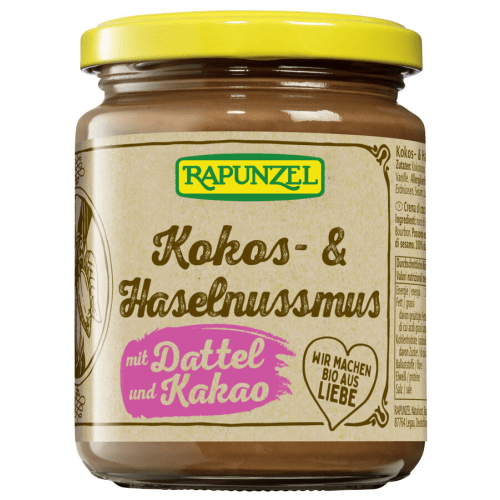 Kokos- & Haselnussmus mit Dattel bio Rapunzel. Diese nussig-süße Verführung zaubert ein ganz besonderes Aroma in deine Speisen! Eco control number: DE-ÖKO-006 Diese nussig-süße Verführung zaubert ein ganz besonderes Aroma in Ihre Speisen. Exotisches Kokosmus in Kombination mit aromatischen Haselnüssen und der leichten Süße von Datteln – ein herrlicher Genuss! Das volle Aroma der Haselnuss entfaltet sich durch das schonende Rösten mit Heißluft aus regenerativen Energien. Zusammen mit den exotischen Kokosraspeln und den fruchtigen Datteln werden diese fein vermahlen. Die sorgfältige Herstellung garantiert Ihnen den einzigartigen Geschmack.Das Mus ist bei kühler Zimmertemperatur streichzart, im Kühlschrank fest und ab ca. 23°C fast flüssig. Je nach Verwendung kannst du die Konsistenz ganz einfach selbst bestimmen! Wenn das Mus wieder fest wird, kann sich das Kokosöl oben absetzen und eine weiße Schicht bilden. Dann einfach wieder unterrühren.
