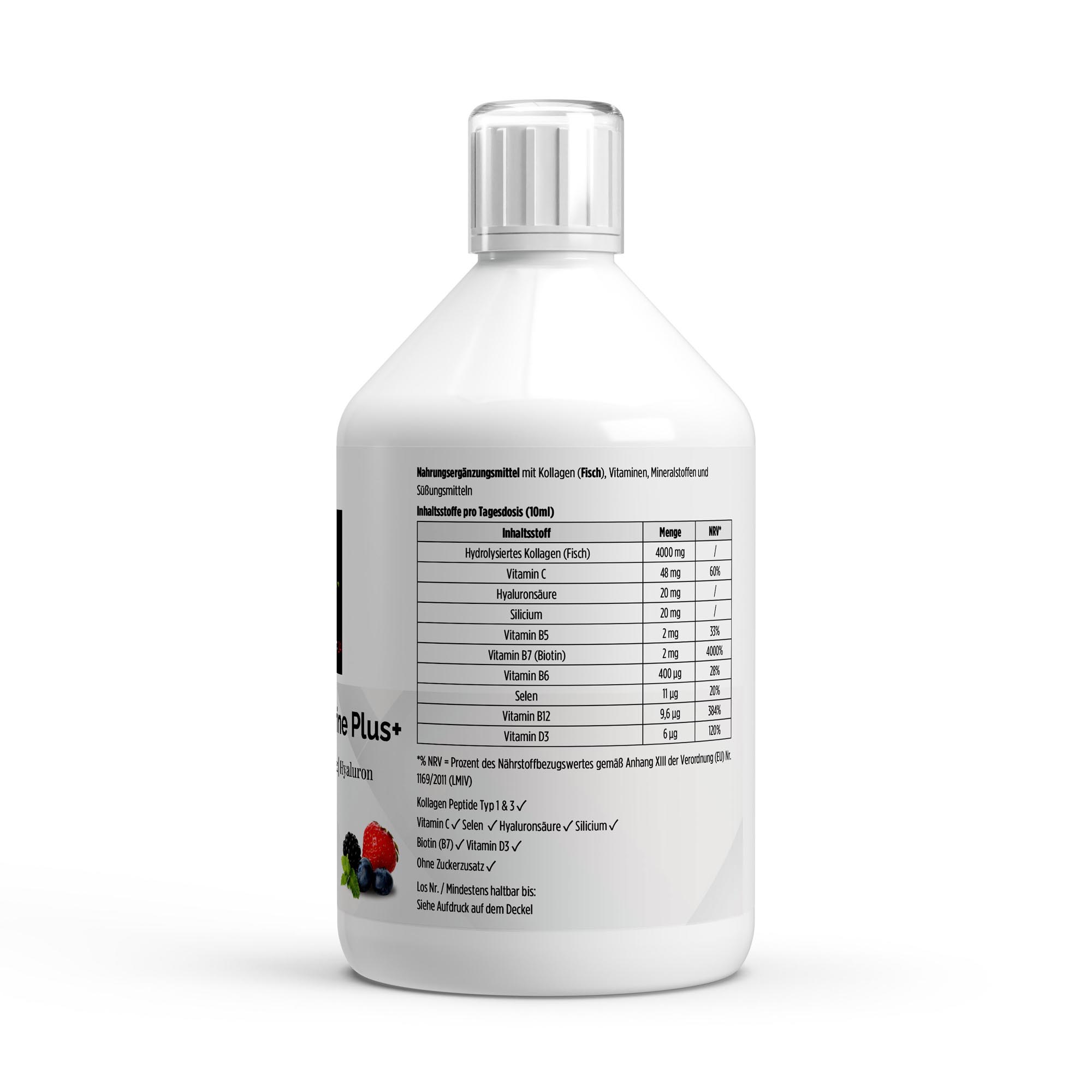 Gefiltertes Wasser, hydrolysiertes Kollagen aus Fisch Typ 1 & 3 (enthält die Aminosäuren: L-Glycin, L-Prolin, L-Alanin, L-Hydroxyprolin, L-Glutaminsäure, L-Arginin, L-Asparaginsäure, L-Serin, L-Lysin, L-Leucin, L-Valin, L-Threonin, L-Phenylalanin, L-Isoleucin, L-Hydroxylysin, L-Methionin, L-Histidin, L-Tyrosin, L-Cystein), Säureregulator: Zitronensäure, Vitamin C (L-Ascorbinsäure), Silicium (Siliciumdioxid), Hyaluronsäure (Natriumhyaluronat), Konservierungsstoffe: (Kaliumsorbat, Natriumbenzoat), natürliche Farbe: lila Kartoffelpulver, Aroma (natürliches Erdbeeraroma), Süßungsmittel: (Steviolglycoside, Sucralose), Vitamin D (Cholecalciferol), Emulgator: Xanthan, Vitamin B5 (Calciumpantothenat), Biotin (D-Biotin), Vitamin B6 (Pyridoxinhydrochlorid), Selen (Natriumselenit), Vitamin B12 (Methylcobalamin).