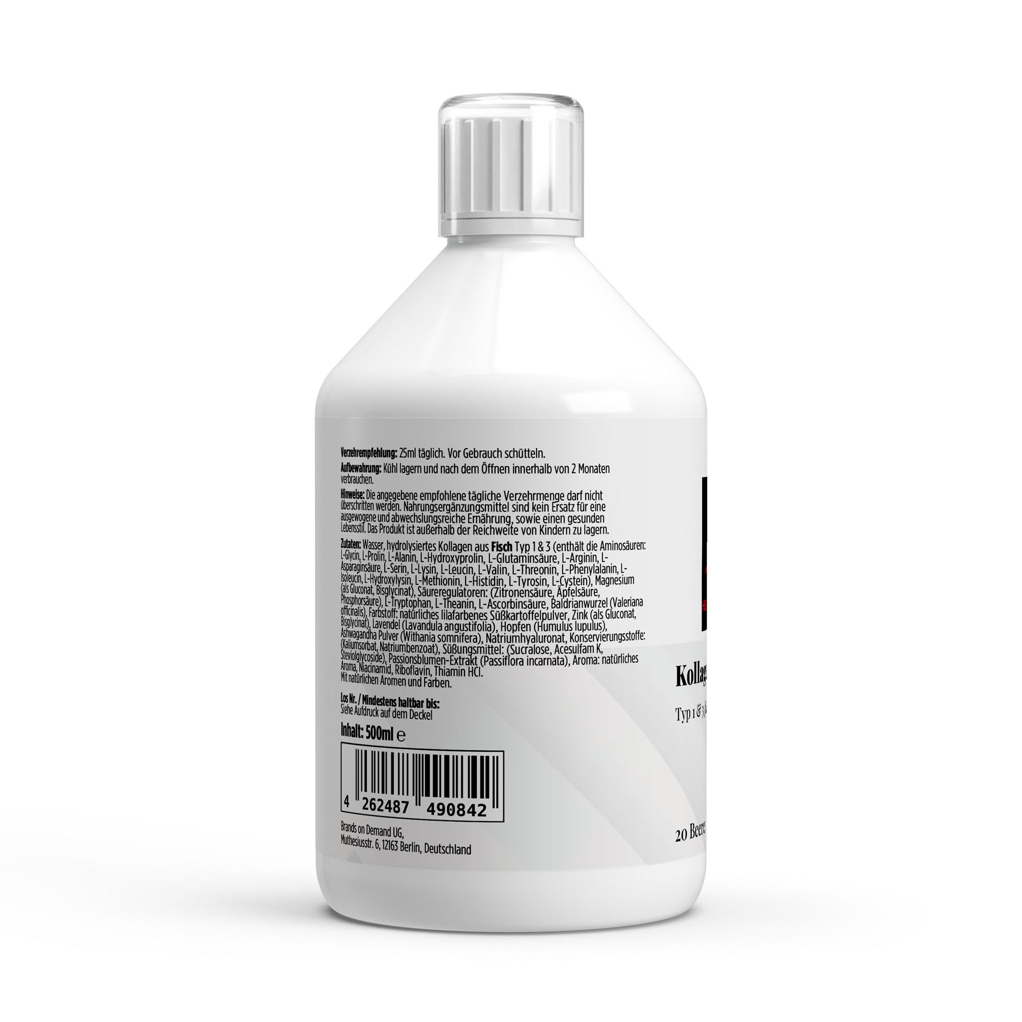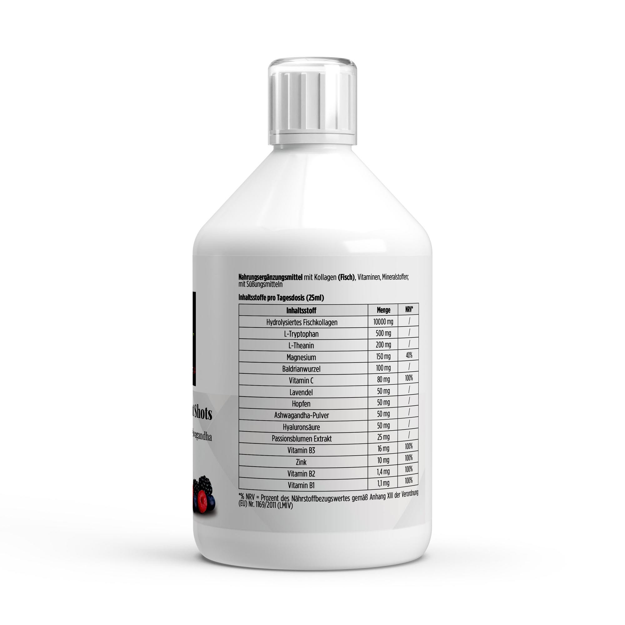 Wasser, hydrolysiertes Kollagen aus Fisch Typ 1 & 3 (enthält die Aminosäuren: L-Glycin, L-Prolin, L-Alanin, L-Hydroxyprolin, L-Glutaminsäure, L-Arginin, L-Asparaginsäure, L-Serin, L-Lysin, L-Leucin, L-Valin, L-Threonin, L-Phenylalanin, L-Isoleucin, L-Hydroxylysin, L-Methionin, L-Histidin, L-Tyrosin, L-Cystein), Magnesium (als Gluconat, Bisglycinat), Säureregulatoren: (Zitronensäure, Äpfelsäure, Phosphorsäure), L-Tryptophan, L-Theanin, L-Ascorbinsäure, Baldrianwurzel (Valeriana officinalis), Farbstoff: natürliches lilafarbenes Süßkartoffelpulver, Zink (als Gluconat, Bisglycinat), Lavendel (Lavandula angustifolia), Hopfen (Humulus lupulus), Ashwagandha Pulver (Withania somnifera), Natriumhyaluronat, Konservierungsstoffe: (Kaliumsorbat, Natriumbenzoat), Süßungsmittel: (Sucralose, Acesulfam K, Steviolglycoside), Passionsblumen-Extrakt (Passiflora incarnata), Aroma: natürliches Aroma, Niacinamid, Riboflavin, Thiamin HCl.