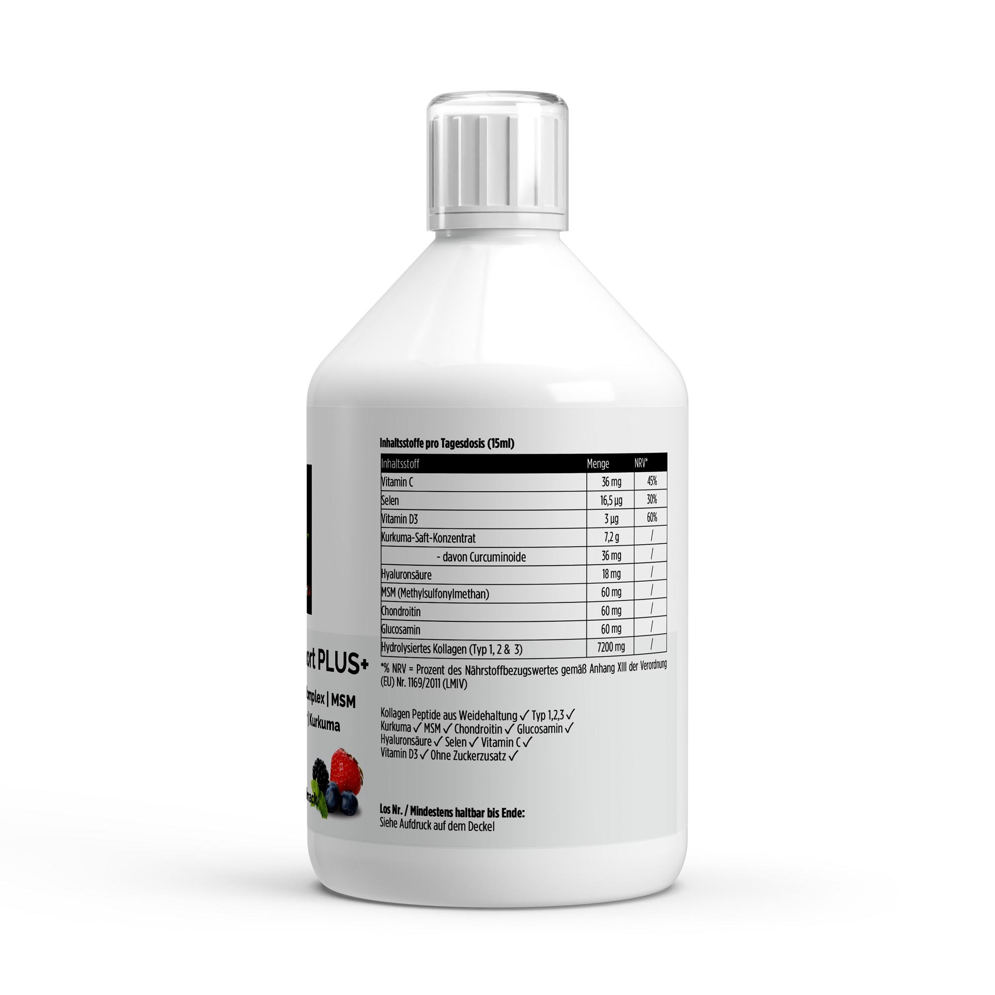 - + Kurkuma, MSM, Chondroitin, Glucosamin, Hyaluronsäure, Selen