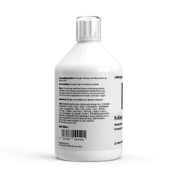 Kurkumasaft aus Konzentrat, hydrolysiertes Kollagen Typ 1, 2 & 3 (enthält die Aminosäuren: L-Glycin, L-Prolin, L-Alanin, L-Hydroxyprolin, L-Glutaminsäure, L-Arginin, L-Asparaginsäure, L-Serin, L-Lysin, L-Leucin, L-Valin, L-Threonin, L-Phenylalanin, L-Isoleucin, L-Hydroxylysin, L-Methionin, L-Histidin, L-Tyrosin, L-Cystein), Säureregulator (Citronensäure), Vitamin C, MSM (Methylsulfonylmethan), Glucosaminsulfat, Chondroitinsulfat, Hyaluronsäure, Aroma (natürliches Aroma), Konservierungsstoffe (Kaliumsorbat, Natriumbenzoat), Farbstoff (Süßkartoffelpulver), Süßungsmittel (Sucralose, Acesulfam-K), Selen, Vitamin D.