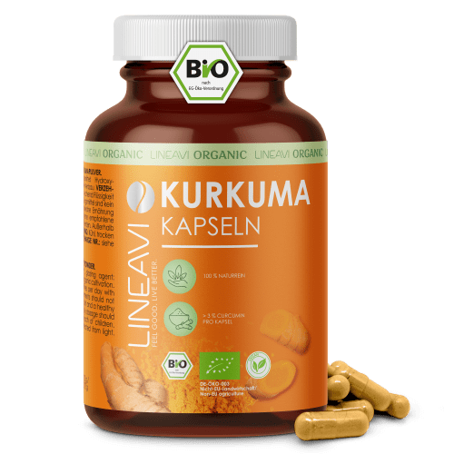 Kurkuma Kapseln bio Kapseln von LINEAVI. Die Gelbwurzel – Die Kraft der Natur neu entdecken Kurkuma ist unter vielen Namen bekannt: „Gelbwurzel“, „Safranwurzel“ oder auch „Gelber Ingwer“. Letzteres kommt nicht von ungefähr – denn Kurkuma gehört zur Familie der Ingwergewächse und erinnert auch äußerlich an Ingwer. Doch beim Aufschneiden zeigt sich der Unterschied: Das Innere leuchtet intensiv gelb. Verantwortlich für diese auffällige Farbe ist das natürliche Curcumin, das auch in vielen Curry-Mischungen für die typische Farbgebung sorgt. Hochwertiges Bio-Kurkuma in veganer Kapsel Für unsere Kurkuma Kapseln wird reines Bio-Kurkuma-Pulver verwendet – gewonnen aus sorgfältig getrockneten und fein vermahlenen Wurzeln. Jede Kapsel enthält 600 mg Kurkuma, ganz ohne Trennmittel wie Magnesiumstearat oder andere Zusatzstoffe. Das Ergebnis ist ein naturbelassenes Qualitätsprodukt in veganer Hülle – ideal für alle, die auf Reinheit und Natürlichkeit setzen. Eco control number: DE-ÖKO-001 Kurkuma, auch als Gelbwurz bekannt, ist eine leuchtend gelbe Wurzel aus der Familie der Ingwergewächse. Seit Jahrhunderten wird sie in der asiatischen Küche und in traditionellen Anwendungen geschätzt – besonders für ihren mild-würzigen Geschmack und ihre vielseitige Verwendbarkeit. Die LINEAVI Kurkuma Kapseln bio enthalten hochwertiges, fein gemahlenes Kurkumapulver aus kontrolliert biologischem Anbau. Die Kapseln sind zu 100 % naturrein, vegan und frei von künstlichen Farb-, Konservierungsstoffen und Aromen – ganz im Einklang mit der EG-Öko-Verordnung. Mit 180 Kapseln pro Dose reicht der Vorrat bei empfohlener Anwendung für rund 22 Tage – ideal für alle, die auf natürliche Qualität setzen.