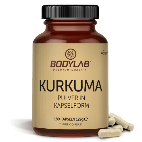 Kurkuma Pulver in Kapselform Kapseln von Bodylab24. BODYLAB Kurkuma Pulver in Kapselform Kurkuma – eine gelbe Knolle die vielen aus der indischen Ayurveda-Lehre bekannt ist und nicht nur vielen Curry-Mischungen die intensiv gelbe Färbung verleiht. Namen hat Kurkuma viele – darunter „Gelb-“ und „Safranwurzel“ oder „Gelber Ingwer“. Insbesondere Gelber Ingwer ist hierzulande sehr gebräuchlich, da die Knolle dem Ingwer im Aussehen stark ähnelt, beim Aufschneiden jedoch eine intensiv gelbe Färbung aufweist. In Kurkuma steckt das Potenzial der Natur. Jede unserer 100% veganen Kapseln enthält 600 mg reines, nach der Trocknung frisch vermahlenes Pulver aus der Kurkumawurzel – ohne weitere Zusätze. Die Tagesdosis – zusammengesetzt aus zwei Dosierungen zu je 4 Kapseln, liefern damit 4,8 g reines Kurkumapulver mit einem Anteil von mehr als 3 % Curcumin, was auch für die gelbe Färbung verantwortlich ist. Durch die vegane Hülle sind die Kapseln auch für Veganer und Vegetarier problemlos verwendbar und können in jede Ernährungsform integriert werden. Die Kapselform ermöglicht eine schnelle und unkomplizierte Einnahme im Alltag und/oder rund um sportliche Aktivitäten. BODYLAB Kurkuma Pulver in Kapselform enthält reines, frisch und fein gemahlenes Kurkumapulver, gewonnen aus der Kurkumawurzel. Je Kapsel sind 600 mg Kurkuma enthalten. Die Kapseln bieten sich als einfach verwendbare und leicht zu dosierende Variante für den Alltag oder rund um sportliche Aktivitäten an. Sie können einfach mit Wasser eingenommen werden – die Tagesdosis kann in zwei Dosierungen zu je 4 Kapseln mit Wasser oder einer anderen Flüssigkeit nach Wahl eingenommen werden.