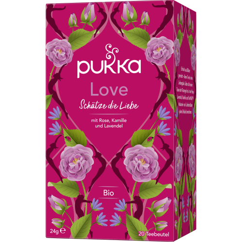 Love Tee bio Pukka. Was ist Love Tee von Pukka und wie wirkt er? Love Tee von Pukka ist eine Teemischung aus Rosen-, Kamillen- und Lavendelblüten, die von Limonen-, Ringelblumen- und Süßholzaromen harmonisch abgerundet wird. Alle Inhaltsstoffe stammen getreu der Firmenphilosophie aus nachhaltigem Anbau und überzeugen in bester Bio-Qualität. Die wohltuend-sanfte Wirkung des leckeren Tees kannst Du sowohl tagsüber als auch nachts jederzeit genießen. Praktische Teebeutel machen den Genuss von Pukkas Love Tea zudem besonders unkompliziert. Lasse das frisch gekochte Wasser kurz stehen, bevor du Love Tee von Pukka aufbrühst und mindestens 5 Minuten ziehen lässt. Solltest Du unter hohem Blutdruckleiden, achte darauf, den Tee nicht übermäßig zu verzehren. Eco control number: GB-ORG-05 Hast du schon deine Liebe zu Tee entdeckt?!