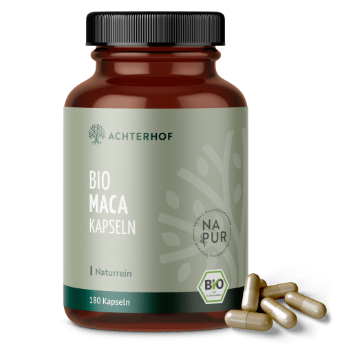Maca Kapseln Bio Kapseln von vom Achterhof. Bio Maca Kapseln ca. 180 Stück Unsere Bio Macakapseln werden mit Liebe und höchster Sorgfalt in einem aufwendigen Verfahren ohne Zusatz von Rieselhilfen (wie z.B. Magnesiumstearat) und Füllstoffen hergestellt. Du erhälst somit ein Naturprodukt höchster Güte. BIO QUALITÄT – Maca-Kapseln vom Achterhof sind 100% BIO. Unser Macawurzelpulver stammt aus kontrolliert biologischem Anbau. Die Kapselhülle besteht aus zertifizierten und rein pflanzlichen Bestandteilen (HPMC) und sind somit auch für die vegane Ernährung geeignet. Eco control number: DE-ÖKO-001 Verzehrempfehlung: 2 x Täglich 3 Kapseln mit ausreichend Flüssigkeit zu sich nehmen. Maca ist eine rübenartige Pflanze, die zur Familie der Kreuzblütengewächse gehört; ihr botanischer Name ist Lepidium meyenii und sie ist in den Anden beheimatet. Der essbare Teil ist ihre Wurzel, sie ist auf den Kordilleren der Anden von Peru und Bolivien, auf einer Höhe zwischen 2.500 und 5.000 m, zu finden.