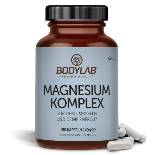 Magnesium Komplex Kapseln von Bodylab24. Hochkonzentrierter Magnesium Komplex von BODYLAB Magnesium – ein lebenswichtiger Mineralstoff, ebenso wie Natrium, Calcium und Kalium. Magnesium ist an etwa 300 verschiedenen Enzymreaktionen in unserem Körper beteiligt, ist wichtig für unsere körpereigene Energieproduktion, für unser Nervensystem, die Zellteilung, den Muskelaufbau, verringert Müdigkeit und Ermüdung, trägt zu einem ausgewogenen Elektrolytgleichgewicht bei und hat noch viele weitere Funktionen*. Eine Aufnahme über die Nahrung ist erforderlich, da Magnesium nicht selbst vom Körper hergestellt werden kann. Die Deutsche Gesellschaft für Ernährung (DGE) empfiehlt Erwachsenen eine Einnahme von 200 – 250 mg Magnesium pro Tag. Unter anderem ist Magnesium in grünen Obst- und Gemüsesorten enthalten. Bei einer ausgewogenen und gesunden Ernährung ist eine ausreichende Aufnahme durch die normale Nahrungsaufnahme möglich, bei starken körperlichen Belastungen oder einer hohen Beanspruchung des Nervensystems und einem daraus resultierenden, erhöhten Bedarf, kann eine zusätzliche Supplementierung über Nahrungsergänzungsmittel sinnvoll sein. Im Zweifel sollte vor der Einnahme ein Arzt konsultiert werden – ein Mangel lässt sich meist nur durch ein Blutbild feststellen. Zusammensetzung der Kreatin Monohydrate Kapseln: Magnesiumcitrat ist chemisch gesehen das Magnesiumsalz der Zitronensäure. Dieser Magnesiumverbindung wird nachgesagt, die beste Bioverfügbarkeit zu haben, da der Wirkstoff schnell und einfach resorbiert werden kann. Magnesiumascorbat ist das Magnesiumsalz der Ascorbinsäure (Vitamin C). In dieser Verbindung sind sowohl Magnesium als auch Vitamin C enthalten. Bei Magnesiumbisglycinat, eine der elementarsten Verbindungen, ist das Magnesium an zwei Moleküle der Aminosäure Glycin gebunden. Diese ist ebenfalls einfach resorbierbar, da es, angebunden an die Aminosäure, nicht mit anderen Mineralstoffen um die gleichen Resorptionswege konkurrieren muss. Diese Magnesiumverbindung trägt besonders zu einer normalen Funktion des Nervensystems bei.* Magnesiummalat ist eine organische Verbindung aus Magnesium, gebunden an Malat, dem Salz der Äpfelsäure. Als Enzymbestandteil spielt diese Magnesiumverbindung eine wichtige Rolle bei der ATP Synthese, so dass diese Verbindung zum Energiestoffwechsel beiträgt.* Bei Magnesiumoxid ist Magnesium mit Oxid verbunden. Magnesiumoxid gilt zwar als weniger gut verfügbar, dafür wird es aber gleichmäßiger und über einen längeren Zeitraum vom Körper resorbiert. Die Verbindungen weisen also unterschiedliche Zusammensetzungen, Bioverfügbarkeiten, Eigenschaften und Wirkschwerpunkte auf. Aus diesem Grund haben wir in den Magnesium Komplex Kapseln fünf verschiedene, elementare Wirkstoffverbindungen miteinander kombiniert. Die Kapseln handelt sind 100% vegan, frei von Trennmitteln, Aromen, Farbstoffen, Stabilisatoren, Konservierungsstoffen und Gelatine. *Magnesium trägt zur Verringerung von Müdigkeit und Ermüdung bei. Magnesium trägt zum Elektrolytgleichgewicht bei. Magnesium trägt zu einem normalen Energiestoffwechsel bei. Magnesium trägt zu einer normalen Funktion des Nervensystems bei. Magnesium trägt zu einer normalen Muskelfunktion bei. Magnesium trägt zu einer normalen Eiweißsynthese bei. Magnesium trägt zur normalen psychischen Funktion bei. Magnesium trägt zur Erhaltung normaler Knochen bei. Magnesium trägt zur Erhaltung normaler Zähne bei. Magnesium hat eine Funktion bei der Zellteilung. Ein hochkonzentrierter Magnesium Komplex aus 5 elementaren Magnesium Komponenten mit 219 mg reinem Magnesium pro Tagesdosis. Durch seine spezielle Zusammensetzung ist das enthaltene Magnesium besonders gut verfügbar. Für Energie, starke Nerven und mehr im Alltag* und beim Sport*. *Magnesium trägt u.a. zu einem normalen Energiestoffwechsel und einer normalen Funktion des Nervensystems bei.