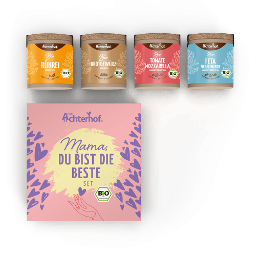 Mama Du bist die Beste Set Bio vom Achterhof. Unsere attraktiven Geschenkboxen und Probiersets aus 100% Papier & Pappe sind ideal für alle, die Gewürze und Kräuter in Premium Qualität lieben. Das Set enthält 4 x Kräuter und Gewürze in unseren praktischen und nachhaltigen Pappdosen mit Korkdeckel. Das Ganze kommt verpackt in einer ansprechenden Box zu dir nach Hause. Eco control number: DE-ÖKO-001 Dieses Set enthält alles an Gewürzen, was du für einen kulinarischen Schlemmerbrunch brauchst. Egal ob leckeres Rührei, frisch gebackenes Brot oder Tomate Mozzarella – mit diesen Gewürzen zauberst du im Nu ein Festtagsfrühstück, dass das Herz erfreut.