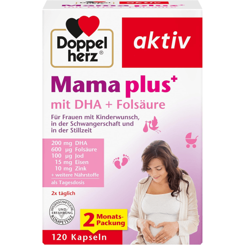 Mama plus+ Kapseln von Doppelherz. Mama plus mit DHA + Folsäure von Doppelherz Folsäure ist ein lebensnotwendiges Vitamin und hat eine Funktion bei der Zellteilung und trägt zum Wachstum des mütterlichen Gewebes während der Schwangerschaft bei. WICHTIG: Allen Frauen mit Kinderwunsch wird empfohlen, mindestens vier Wochen vor der Empfängnis an eine ausreichende Folsäureversorgung zu denken. Aber auch während Schwangerschaft und Stillzeit ist der Bedarf deutlich erhöht. Jod spielt eine Rolle für die normale Produktion der Schilddrüsenhormone, die wichtige Aufgaben im Stoffwechsel erfüllen. Schilddrüsenhormone steuern viele Stoffwechselprozesse wie z. B. Wachstum, Energiestoffwechsel, Knochenbildung sowie die Entwicklung des Gehirns. Bei schwangeren Frauen ist die Jodversorgung der Mutter wichtig, da durch sie auch das ungeborene Kind mitversorgt wird. Eisen unterstützt die normale Bildung der roten Blutkörperchen und den normalen Sauerstofftransport im Körper. Der Bedarf erhöht sich in der Schwangerschaft um das Doppelte. Zink leistet einen Beitrag zur normalen Funktion des Immunsystems und zum Schutz der Zellen vor oxidativem Stress. Magnesium trägt zum normalen Energiestoffwechsel und zur normalen Funktion des Nervensystems und der Muskeln bei. Vitamin C unterstützt die normale Funktion des Immunsystems und leistet zusammen mit Vitamin E einen Beitrag zum Schutz der Zellen vor oxidativem Stress. Der „Calcium-Einbauhelfer“ Vitamin D unterstützt die Verwertung von Calcium und spielt eine Rolle für den Knochenerhalt. Vitamin D kann der Körper durch regelmäßige Einwirkung von Sonnenlicht auf die Haut selbst herstellen. Diese Eigenproduktion reicht in unseren Breitengraden jedoch oft nicht aus. Vitamin B1 und Vitamin B2, Nicotinamid und Pantothensäure unterstützen den normalen Energiestoffwechsel. Vitamin B6 trägt zum normalen Eiweißstoffwechsel bei. Vitamin B12 leistet einen Beitrag zur normalen Bildung der roten Blutkörperchen und zur normalen Funktion des Nervensystems. Biotin unterstützt die Erhaltung gesunder Haut und Haare. DHA – wertvolle Omega-3-Fettsäure für Mutter und Kind Die Aufnahme der Omega-3-Fettsäure DHA (Docosahexaensäure) durch die Mutter trägt zur normalen Entwicklung der Augen und des Gehirns beim Fötus und beim gestillten Säugling bei. Hierfür sollten zusätzlich zu der für Erwachsene empfohlenen Tagesmenge an Omega-3-Fettsäuren täglich 200 mg DHA aufgenommen werden. Omega-3-Fettsäuren kann der Mensch ohne Zufuhr entsprechender Vorstufen nicht selbst bilden – er muss sie mit der Nahrung aufnehmen. Wichtige Vertreter der Omega-3-Fettsäuren sind die Eicosapentaensäure (EPA) und die Docosahexaensäure (DHA). Aber nur wenige Lebensmittel enthalten diese wertvollen Fettsäuren. Gute Quellen sind fette Kaltwasserfische, wie z. B. Lachs, Hering und Makrele. Es wird empfohlen, täglich 2 Kapseln Mama plus mit DHA + Folsäure von Doppelherz zum Mittagessen einzunehmen. Das Produkt ist für werdende als auch für Mütter mit Kleinkindern entwickelt worden. Für Frauen mit Kinderwunsch sowie in Schwangerschaft und Stillzeit spielt die Ernährung eine wichtige Rolle für ihr Wohlbefinden bzw. die Versorgung ihres Kindes mit allen wichtigen Nährstoffen. So steigt der Bedarf an einigen Vitaminen und Mineralstoffen sowie mehrfach ungesättigten Omega-3-Fettsäuren in dieser Lebensphase deutlich an. Eine ausgewogene und abwechslungsreiche Ernährung ist daher besonders wichtig. Demgegenüber hat die Nationale Verzehrsstudie (2008) jedoch gezeigt, dass insbesondere die Versorgung mit Folsäure, Jod, Eisen sowie Omega-3-Fettsäuren gerade bei Frauen häufiger nicht optimal ist. Doppelherz Mama plus mit DHA + Folsäure liefert 600 µg Folsäure zusammen mit allen weiteren lebenswichtigen B-Vitaminen sowie den Mineralstoffen Calcium, Magnesium, Eisen, Zink und 100 µg Jod. Zusätzlich enthalten die Kapseln wertvolle Omega-3-Fettsäuren einschließlich 200 mg DHA pro Tag.