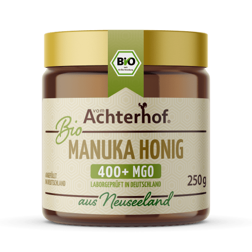 Manuka Honig Bio 400+ MGO vom Achterhof. Bio Manuka Honig MGO 400+ – zertifiziert und laborgeprüft Unser laborgeprüfter und mehrfach zertifizierter Bio Manuka Honig mit 400 mg/kg Methylglyoxal ist nicht nur besonders aromatisch und genussvoll im Geschmack, sondern unterstützt als rein natürliches Naturprodukt mit der geballten Kraft von Manuka auch dein ganz persönliches Wohlbefinden. Besonders aromatisch im Geschmack Da es sich um ein naturreines Produkt handelt, kann die Farbe unseres Honigs von hell- bis dunkelbraun variieren. Der Geschmack ist besonders aromatisch mit einer würzigen Note und einem feucht erdig schmeckenden Nachklang. Auf jeden Fall wird dieser ganz besondere Honig ein Hauch von Luxus für deinen Gaumen sein. Bio Manuka Honig – importiert aus Neuseeland mit nachgewiesenem MGO-Gehalt Der vom Achterhof Bio Manuka Honig MGO 400+ wird aus Neuseeland importiert, da der besondere Nektar mit dem hohen Gehalt an Methylglyoxal (MGO) aus der Südseemyrte gewonnen wird. Die Maori nennen diesen Baum in ihrer Sprache Manuka. Sie verehren die Südseemyrte und verwenden nicht nur den Nektar, sondern auch die Blüten und Blätter. Methylglyoxal ist ein Stoffwechselendprodukt, das in jedem menschlichen Organismus vorkommt. MGO wird im Verdauungstrakt der Biene bei der Abspaltung von Zucker produziert und über Enzyme abgebaut. In der Regel erhalten handelsübliche Honigsorten etwa ein bis zwei Milligramm Methylglyoxal pro Kilo, unser vom Achterhof Bio Manuka Honig enthält 400mg/kg; dieser Wert ist bei uns auch laboranalytisch nachgewiesen. Höchste Qualitätsstandards und glückliche Bienen sind unser höchstes Anliegen Qualität ist bei uns oberste Prämisse. So wird unser Bio Honig beispielsweise weniger erhitzt und schonender hergestellt als andere Manuka-Sorten. Als einer der wenigen Hersteller bieten wir unseren Manuka Honig zudem in Bio-Qualität an. Der Gehalt an Methylglyoxal (MGO) für unseren Bio Manuka Honig wird regelmäßig von staatlich lizensierten Laboren in Neuseeland und Deutschland kontrolliert. Jede einzelne Charge wird separat überprüft. In Neuseeland kontrolliert die AssureQuality die Einhaltung der Vorschriften für den organischen Anbau und die Nachhaltigkeit biologischer Lebensmittel. In Deutschland wird der importierte Honig nur durch Imkereibetriebe abgefüllt, die wie auch wir biozertifiziert sind. Als Unternehmen mit hohen Nachhaltigkeitswerten liegt uns natürlich auch das Wohl der Bienen am Herzen. Aus diesem Grund achten wir bei der Auswahl der Imker darauf, dass diese ethisch orientiert sind und Wert darauf legen, die natürliche Gesundheit des Bienenstocks aufrechtzuerhalten. Unsere Imker in Neuseeland arbeiten zwar langsamer, dafür aber bewusster, um kritische Bereiche bienenfrei zu machen, und um möglichst keine Bienen zu quetschen, z.B. beim Wabenziehen und beim Aufeinandersetzen der Kästen. Die Bienen erhalten vorwiegend Nahrung aus Wildpflanzen und bei der Behandlung der Varroamilben werden natürliche, biologisch ätherische Öle und keine chemischen Dämpfe verwendet. Um Plastik zu vermeiden und um sicherzustellen, dass keine Weichmacher in unseren hochwertigen Bio Manuka Honig gelangen, haben wir uns entschieden, unseren Honig in Gläsern abzufüllen. So können wir unsere Qualität weiterhin sicherstellen und gleichzeitig noch einen Beitrag für unsere Umwelt leisten. Qualitätsversprechen – Mit Respekt vor der Natur Mit dem vom Achterhof Bio Manuka Honig MGO 400+ kannst du dir sicher sein, dass du ein Qualitätsprodukt erster Güte bekommst, denn unser Honig ist ein Stück reinster Natur: Eco control number: DE-ÖKO 001 Unser laborgeprüfter und mehrfach zertifizierter Bio Manuka Honig mit 400 mg/kg Methylglyoxal wird aus Neuseeland importiert, da der besondere Nektar mit dem hohen Gehalt an Methylglyoxal (MGO) nur aus der dort einheimischen Südseemyrte gewonnen werden kann. In der Regel erhalten handelsübliche Honigsorten etwa ein bis zwei Milligramm Methylglyoxal pro kg. Unser vom Achterhof Bio Manuka Honig enthält 400mg/kg. Dieser Wert ist bei uns auch laboranalytisch nachgewiesen. Und die Bienen haben wir dabei auch im Auge, denn wir arbeiten mit einer ethischen Imkerei vor Ort zusammen, die Wert darauf legen, die natürliche Gesundheit des Bienenstocks aufrechtzuerhalten.