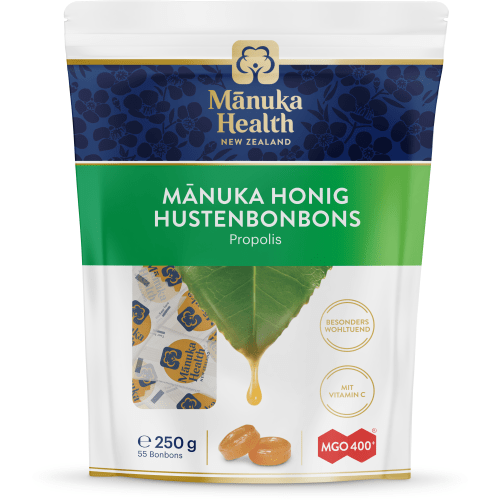 Manuka MGO 400 Hustenbonbons Manuka Health mit propolis Geschmack in der 0.25KG Packung. Was ist Manuka MGO 400+ Lutschbonbons von Manuka Health und wie wirken sie? Manuka MGO 400+ Lutschbonbons von Manuka Health haben die Kraft des neuseeländischen Manuka Honigs in sich und sind ein wahres Naturprodukt. Damit sind die Bonbons eine gute Wahl für alle, die gesund und fit sein wollen. Lutsche 1 oder mehrere Bonbons am Tag für ein wohltuendes Gefühl im Hals. Wohltuendes Gefühl für den Hals!